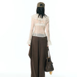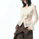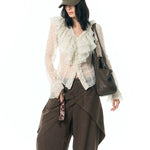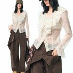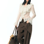 The blouse features a delicate sheer fabric with tiny polka dots, finished with cascading ruffles along the neckline and cuffs for a soft, vintage-inspired elegance. Lightweight yet eye-catching, it adds a dreamy contrast to the structured bottoms.