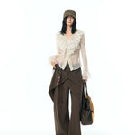 Paired with wide-leg winter pants in a warm fabric, designed with a unique draped overlay and asymmetrical button detail, this set balances playful femininity with utilitarian edge. Perfect for autumn–winter styling, whether dressed up with boots or kept casual with flats.