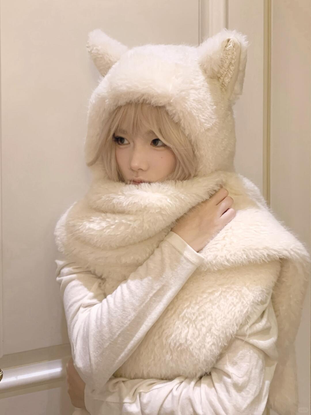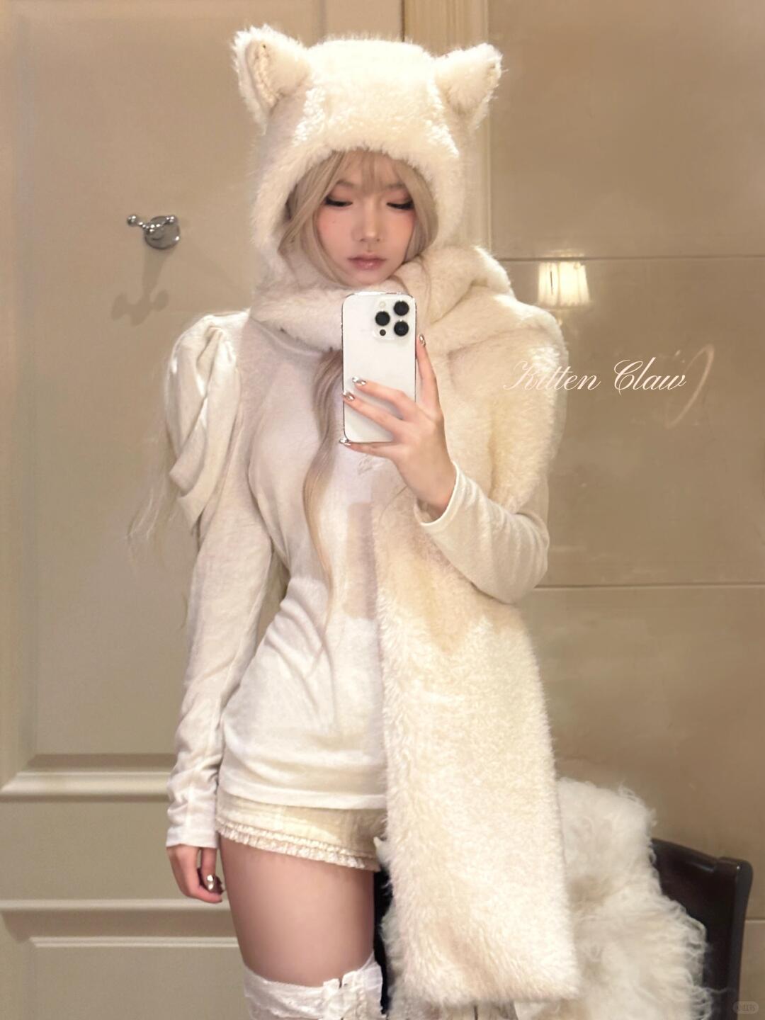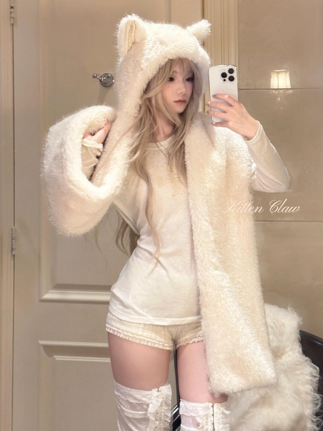 A signature cat-ear hooded scarf by KittenClaw, blending plush texture with delicate lace details.