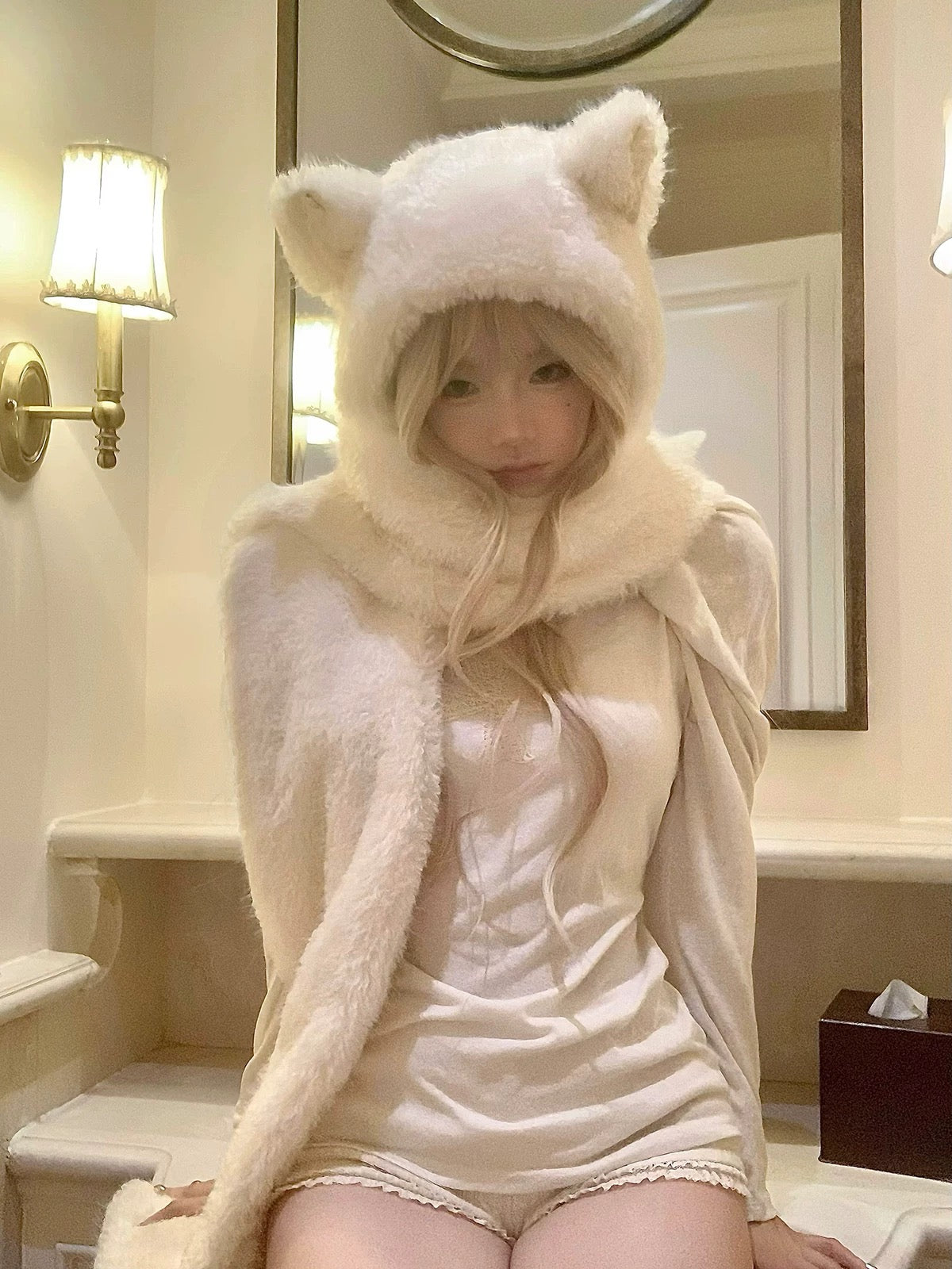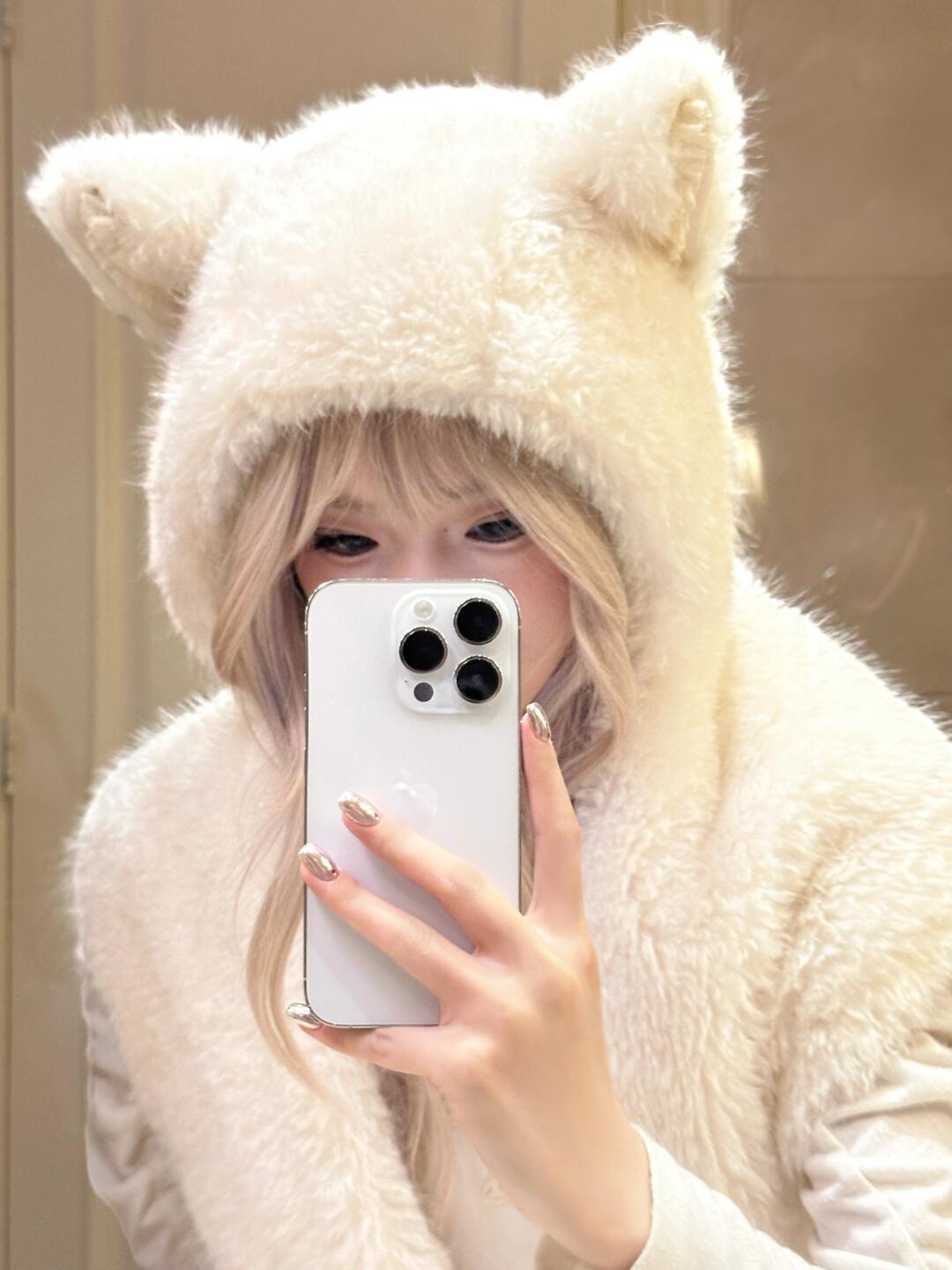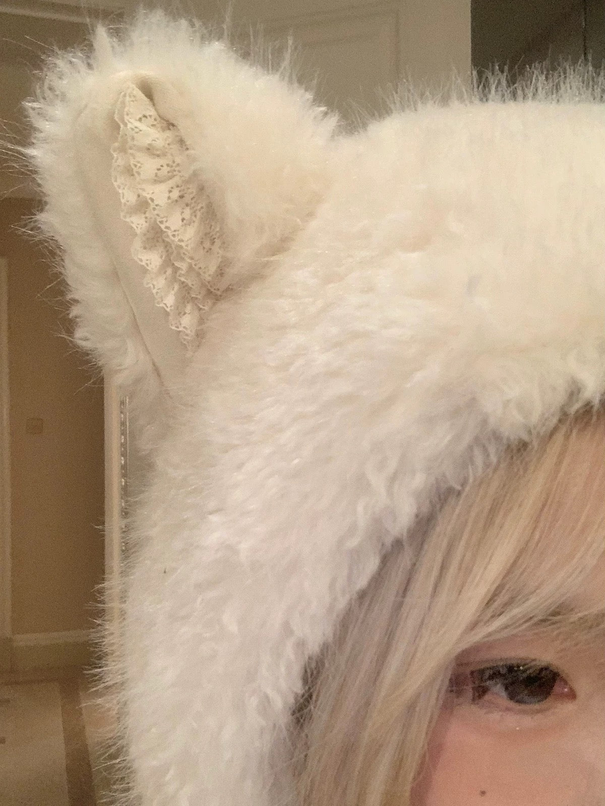 A signature cat-ear hooded scarf by KittenClaw, blending plush texture with delicate lace details.