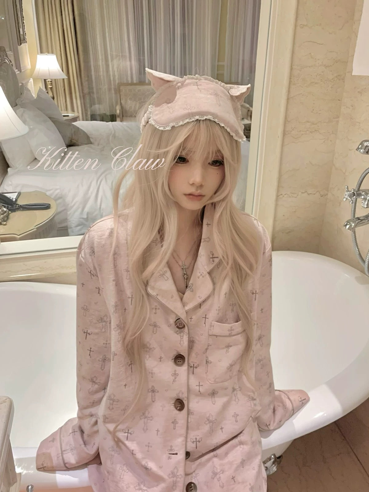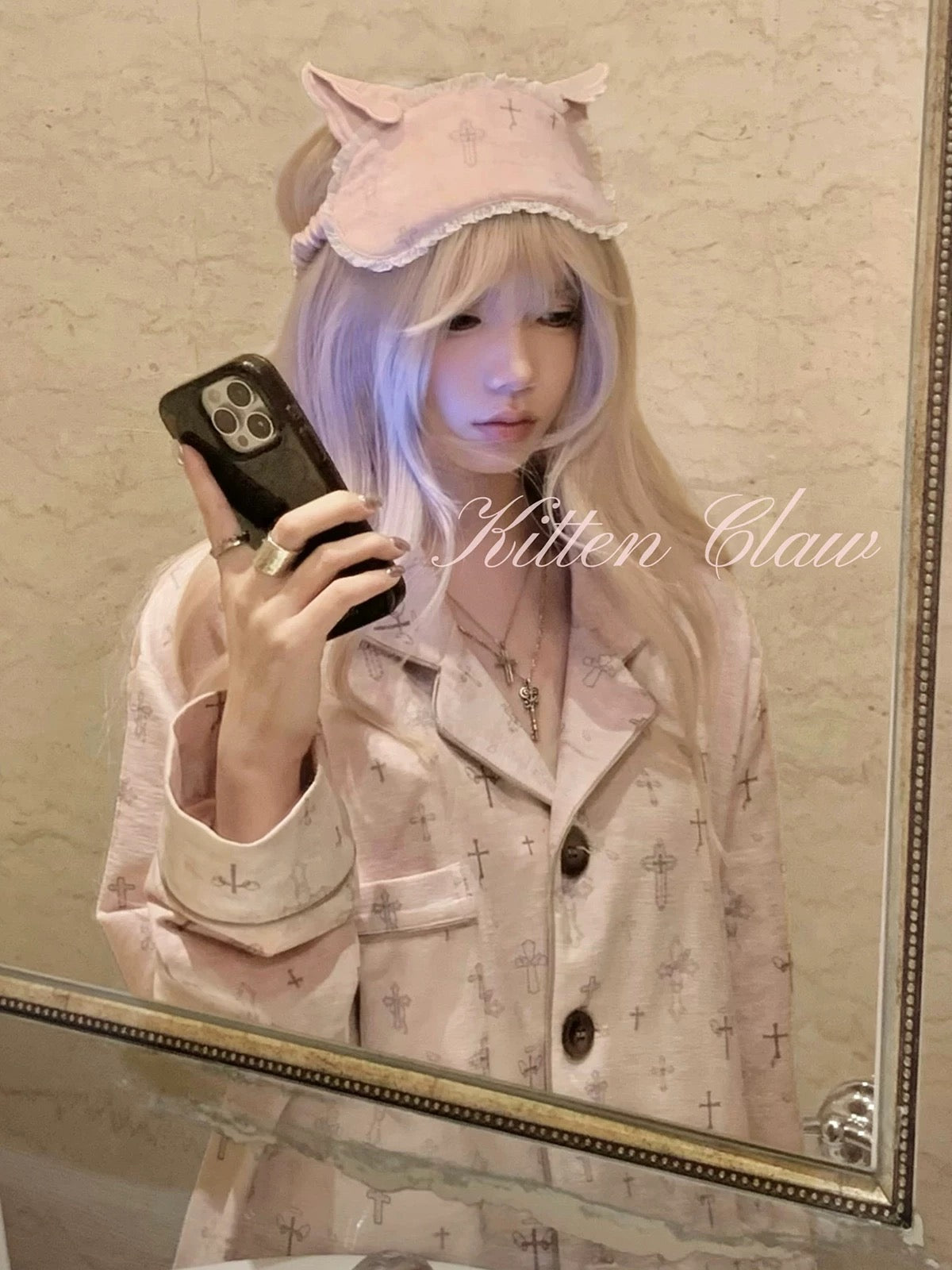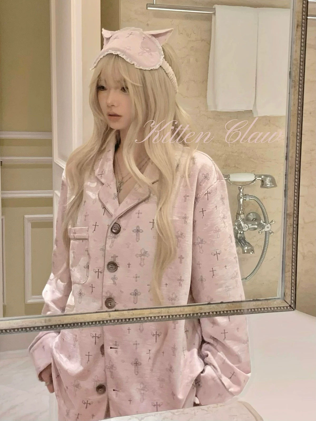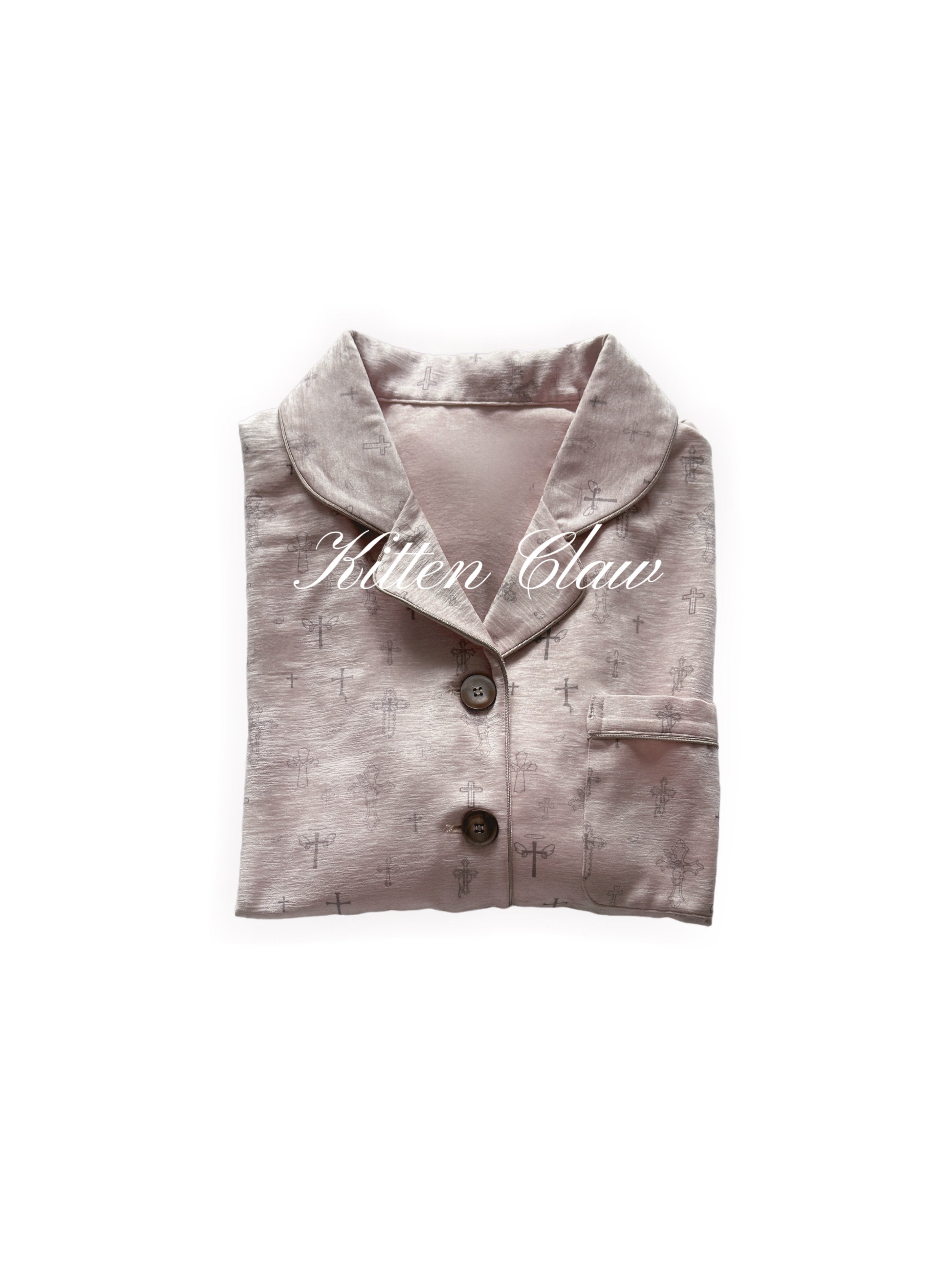 A signature sleepwear set by KittenClaw, designed around delicate cross motifs and a soft, dreamy silhouette.