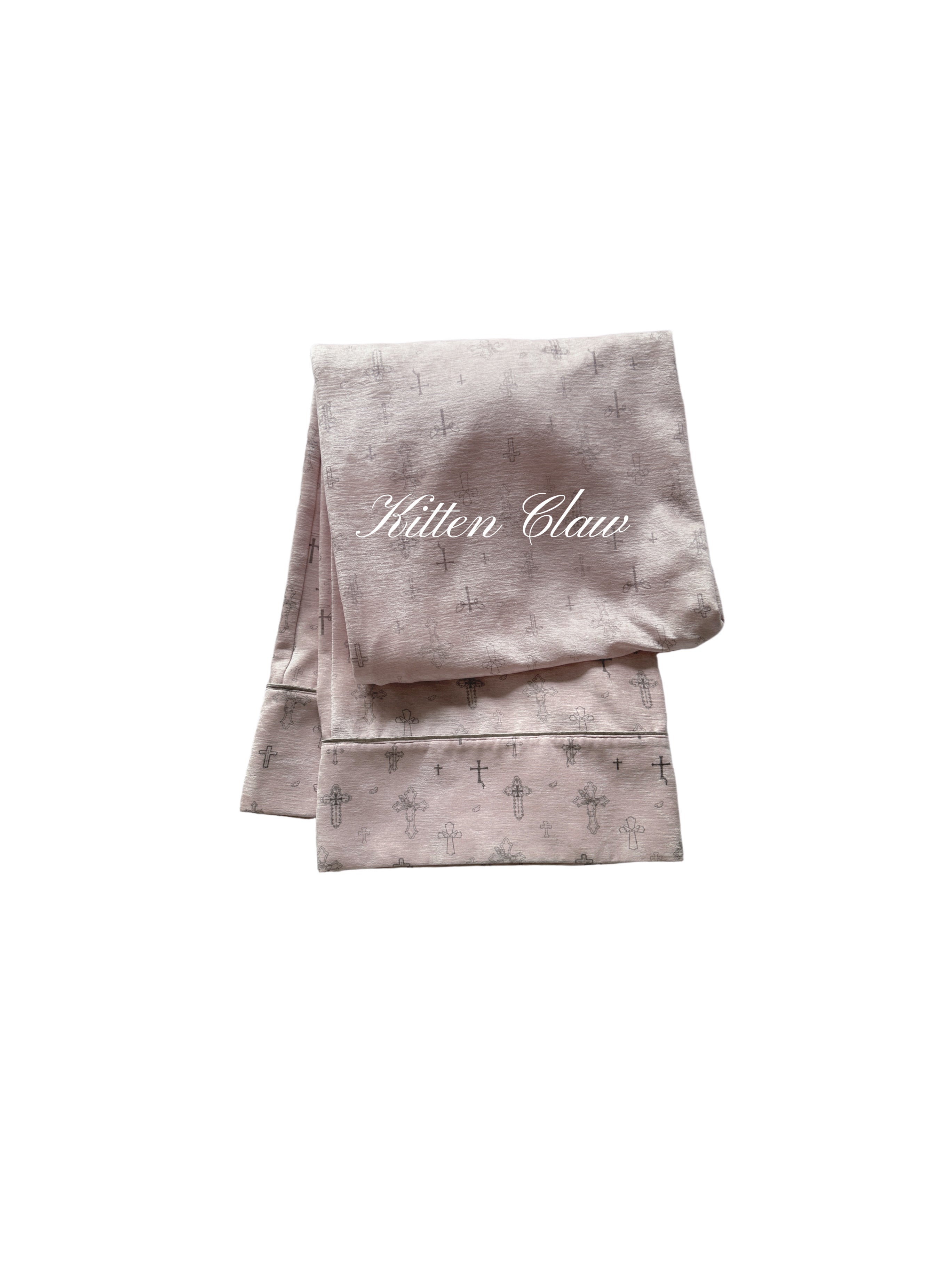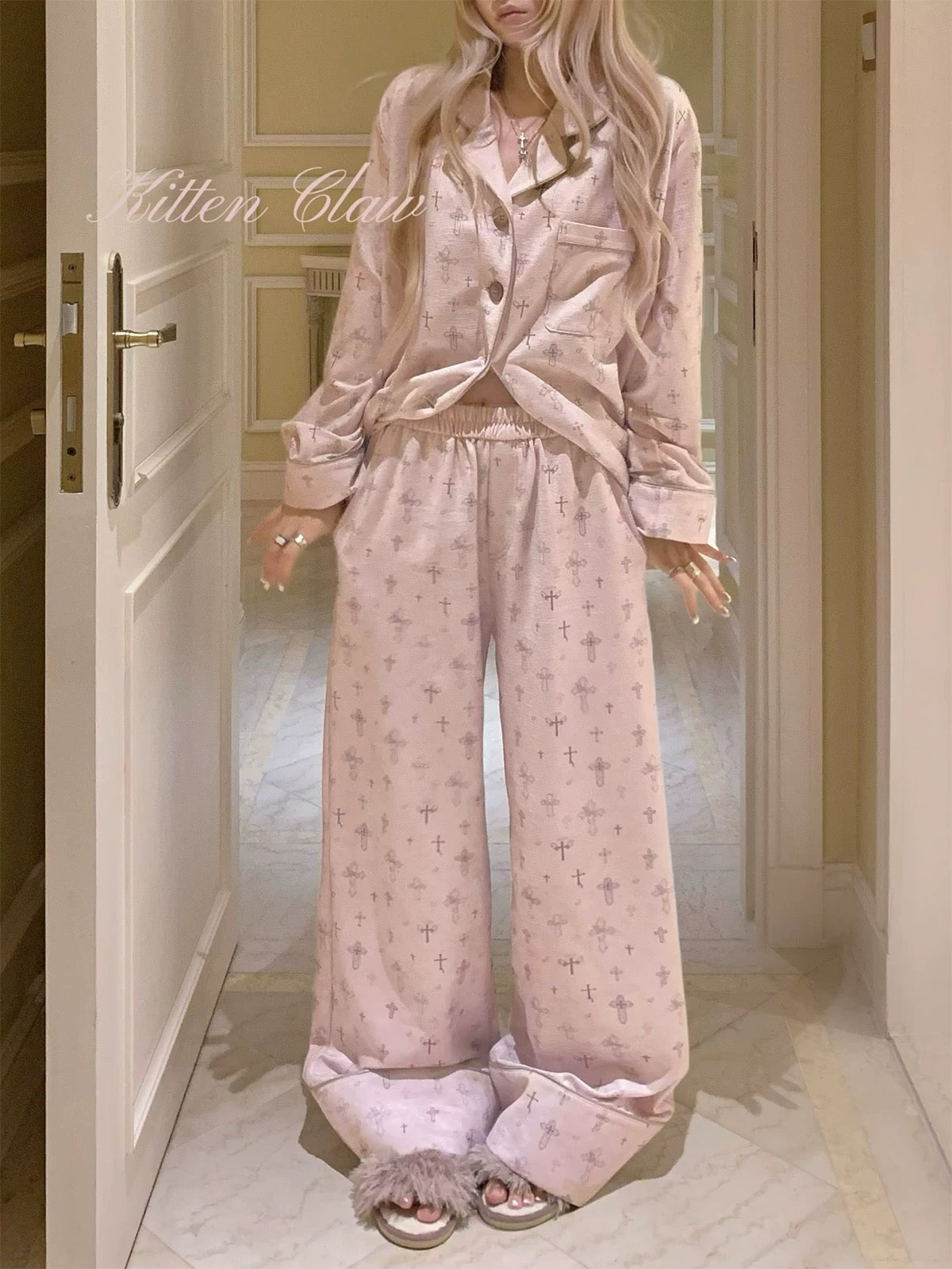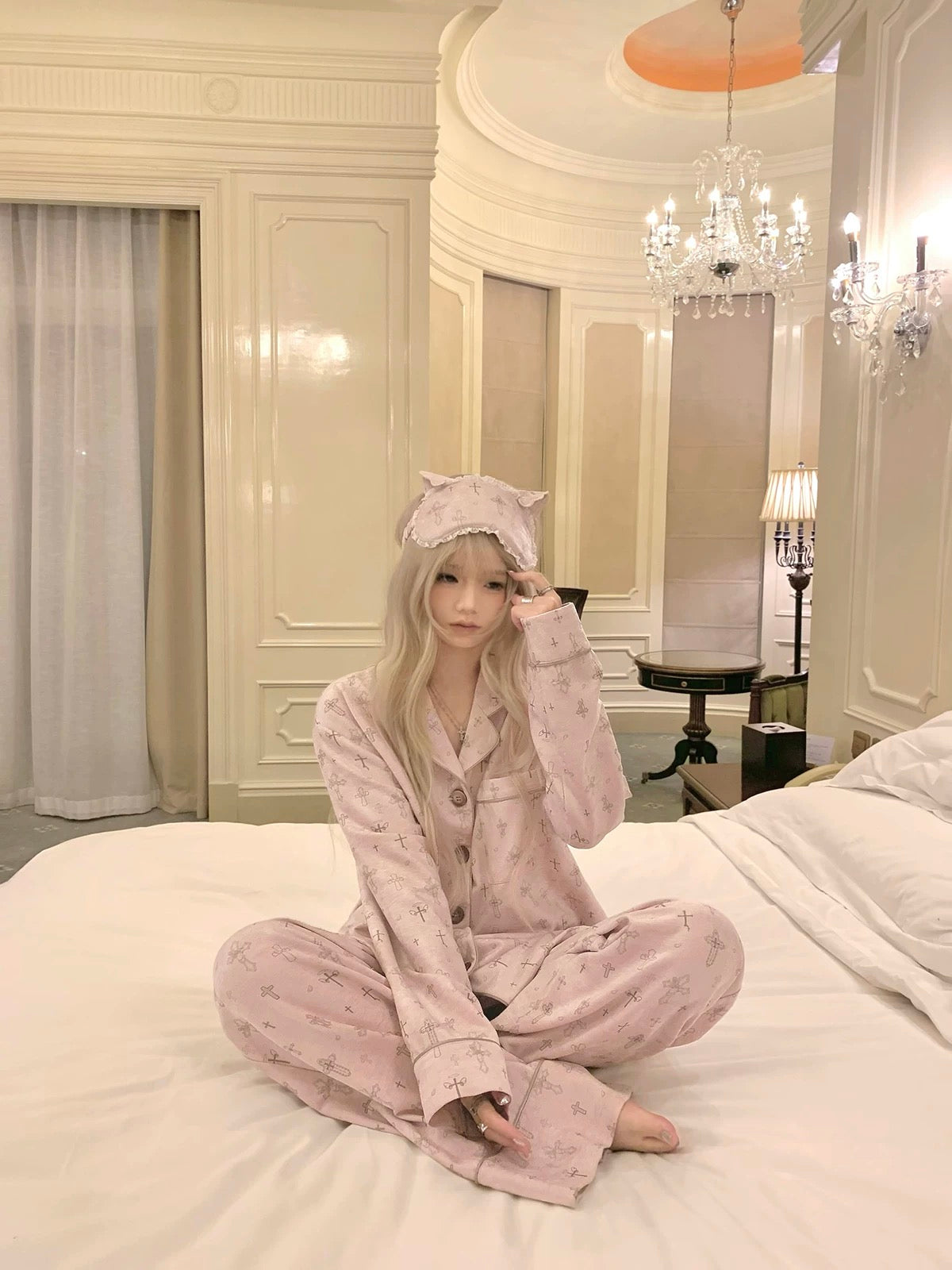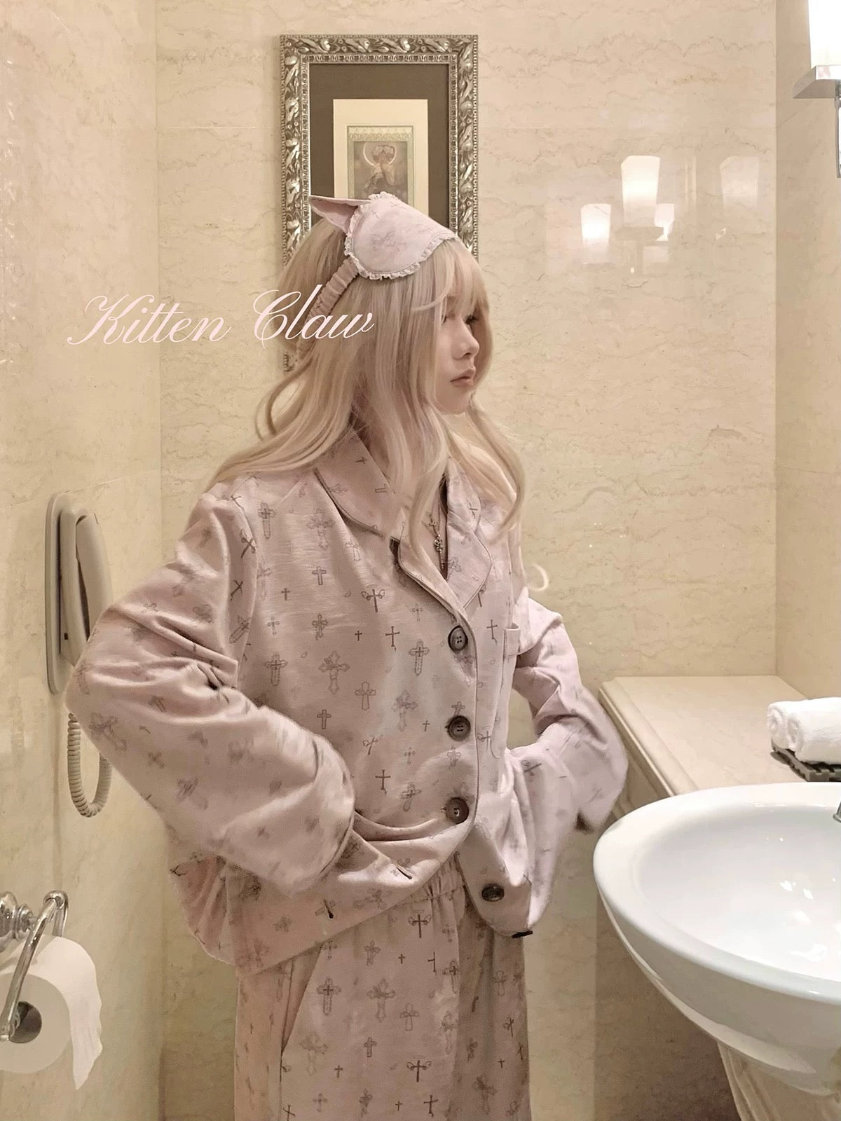 A signature sleepwear set by KittenClaw, designed around delicate cross motifs and a soft, dreamy silhouette.