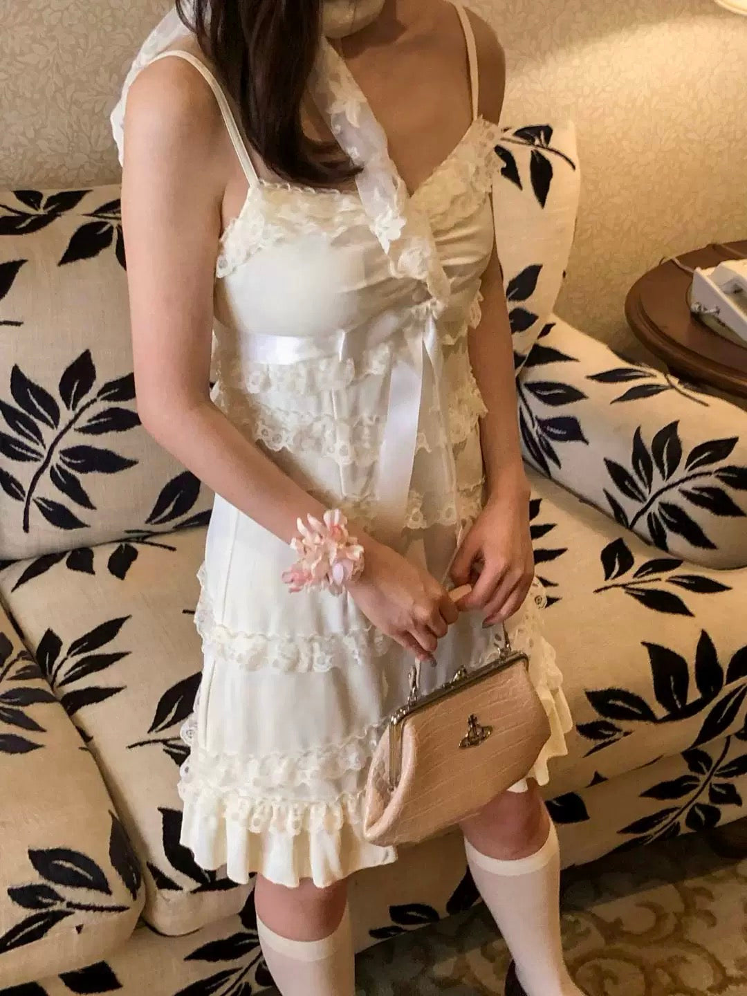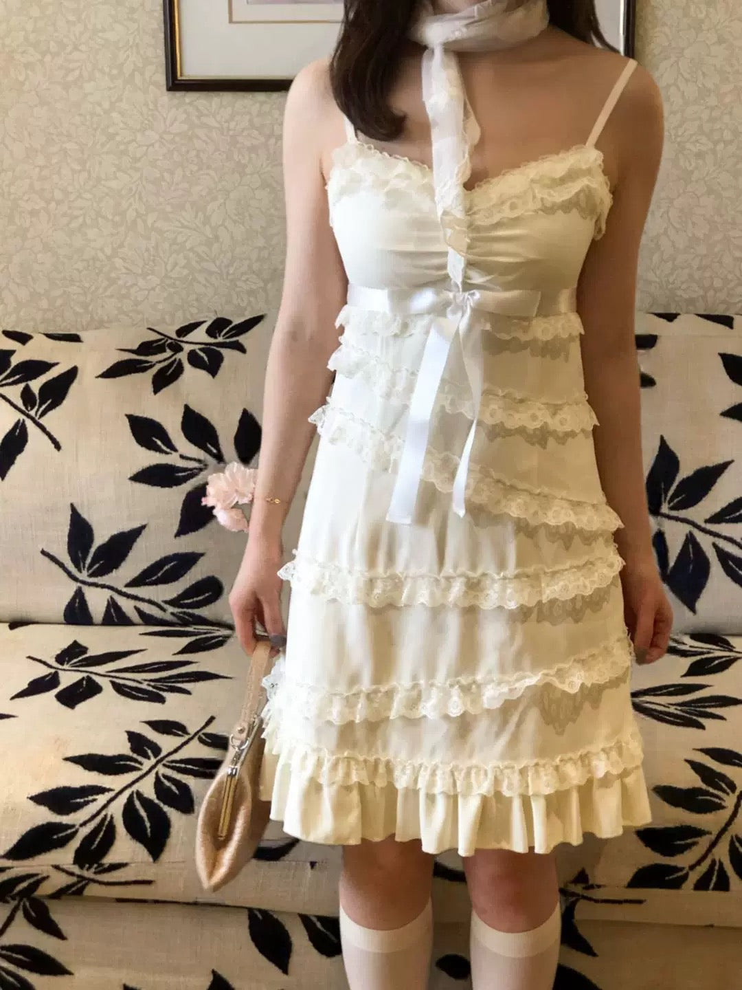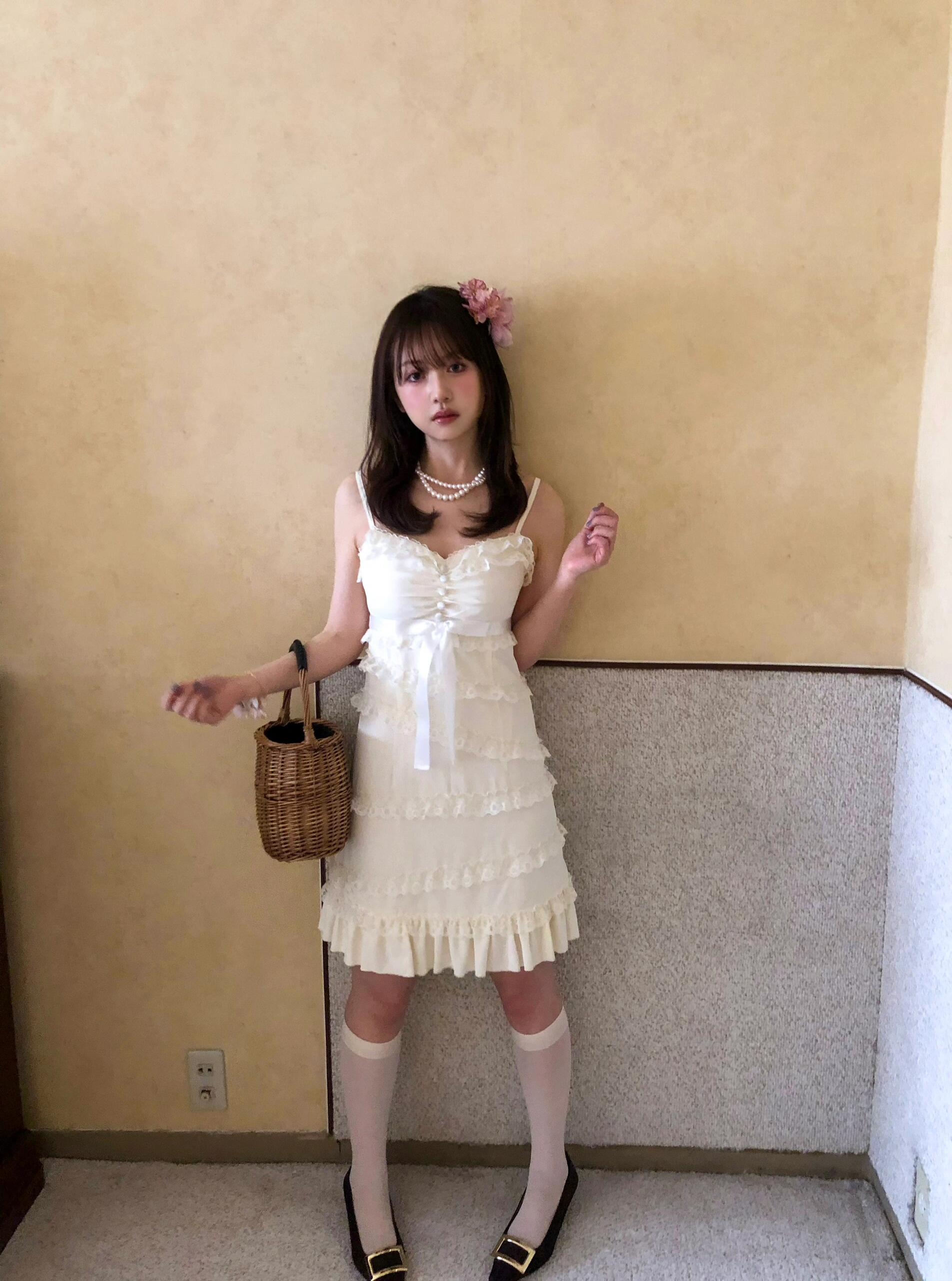 The asymmetrical lace detailing at the skirt is the perfect finishing touch, giving the dress a “cute little cake” vibe. Paired with a vintage lace shawl, this dress exudes even a princess vibes, effortlessly capturing that nostalgic, romantic charm.