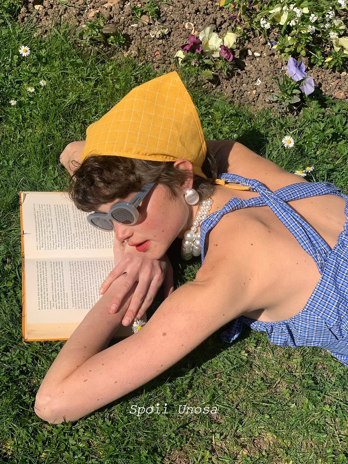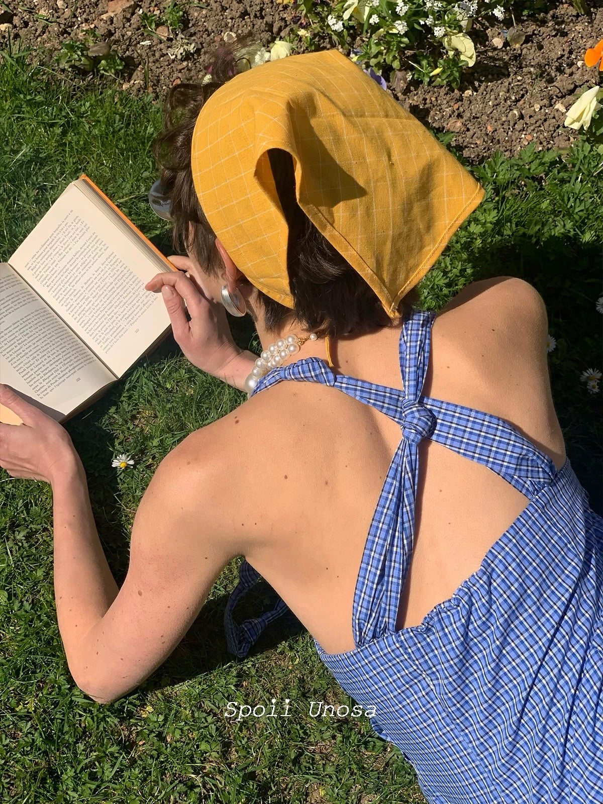 Inspired by the sky above Mediterranean cliffs, the blue and white gingham captures the essence of a sea breeze frozen in time — its crisp silhouette concealing a youthful innocence.