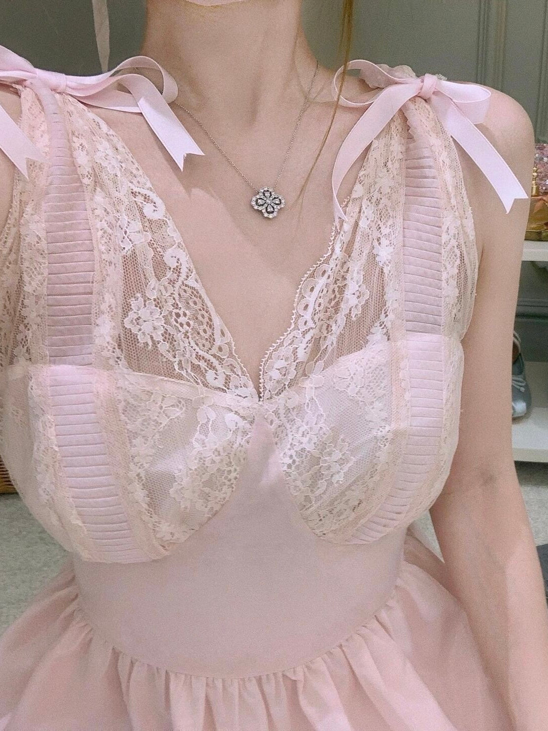 🌸The ribbon-tied shoulder straps elegantly gather the lace, evoking the opulence of Victorian-era ball gowns.
