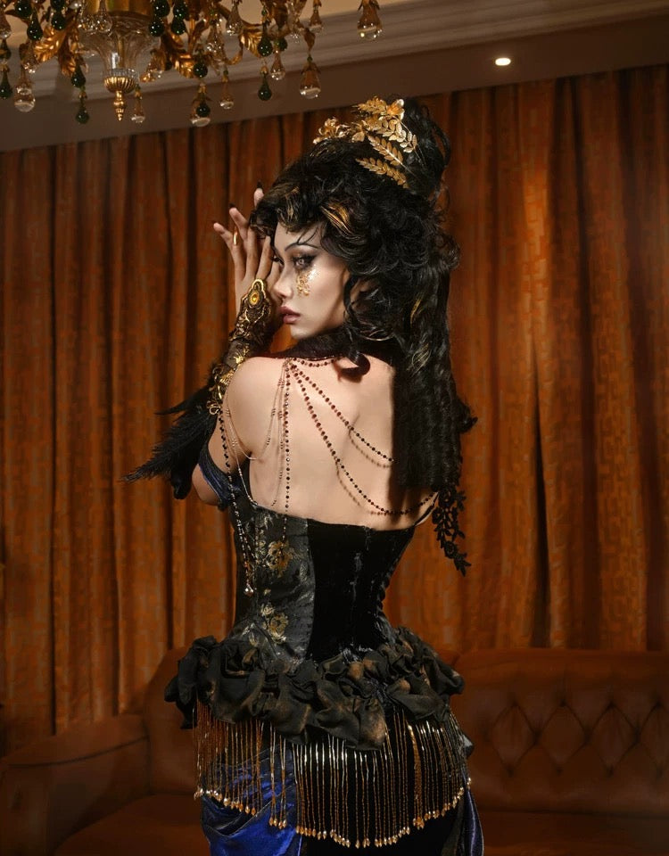 Step into a world of opulence with this baroque-inspired corset gown, crafted in gilded fabrics that shimmer like candlelight at dusk. The bodice is richly decorated with hand-stitched floral appliqués, cascading ruffles, and golden tassel fringes, creating a striking interplay of texture and light.