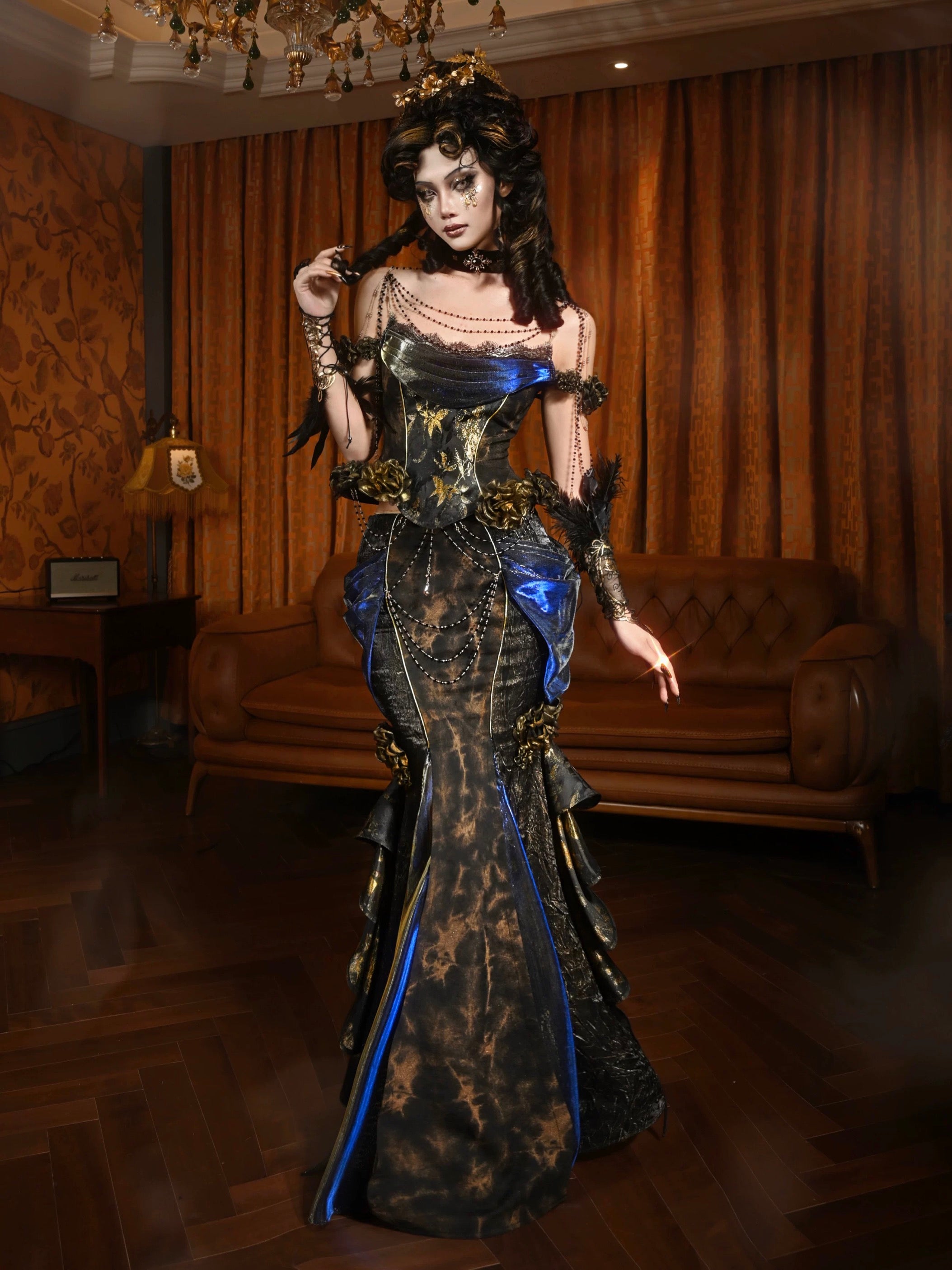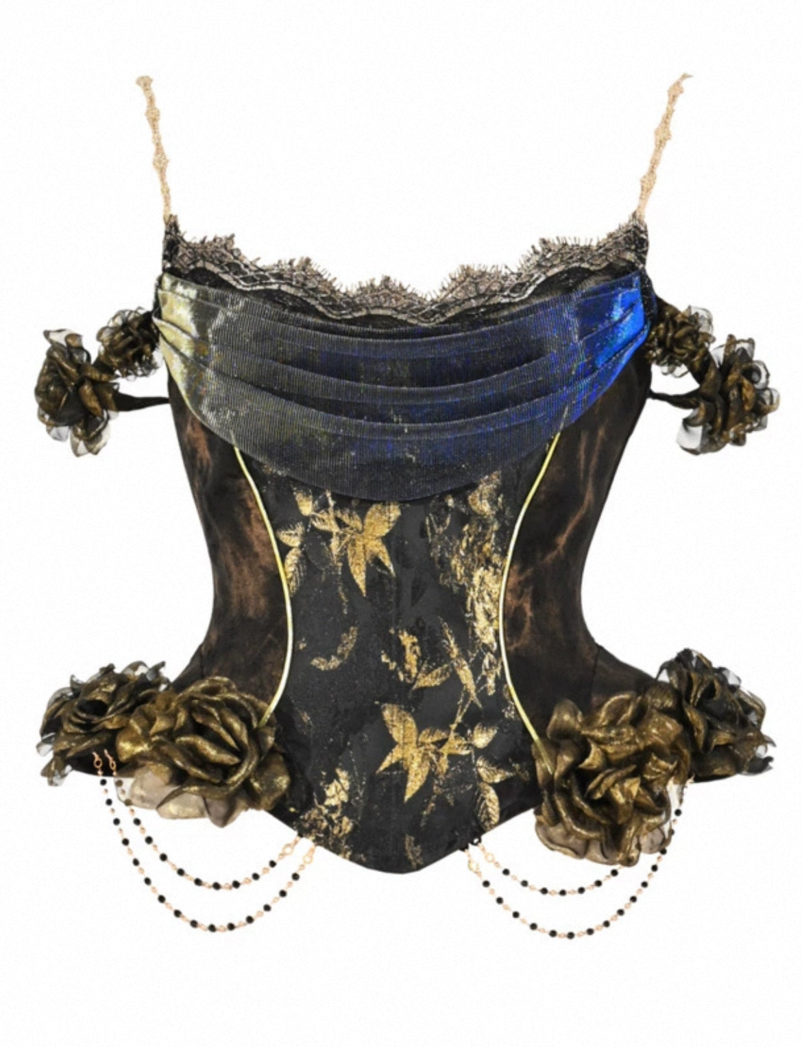 Crafted from shimmering gold jacquard with layered embroidery, this corset is adorned with handcrafted roses and delicate draped bead chains. The subtle sheen of blue and bronze fabrics evokes the glow of twilight, turning every movement into a scene of grandeur.