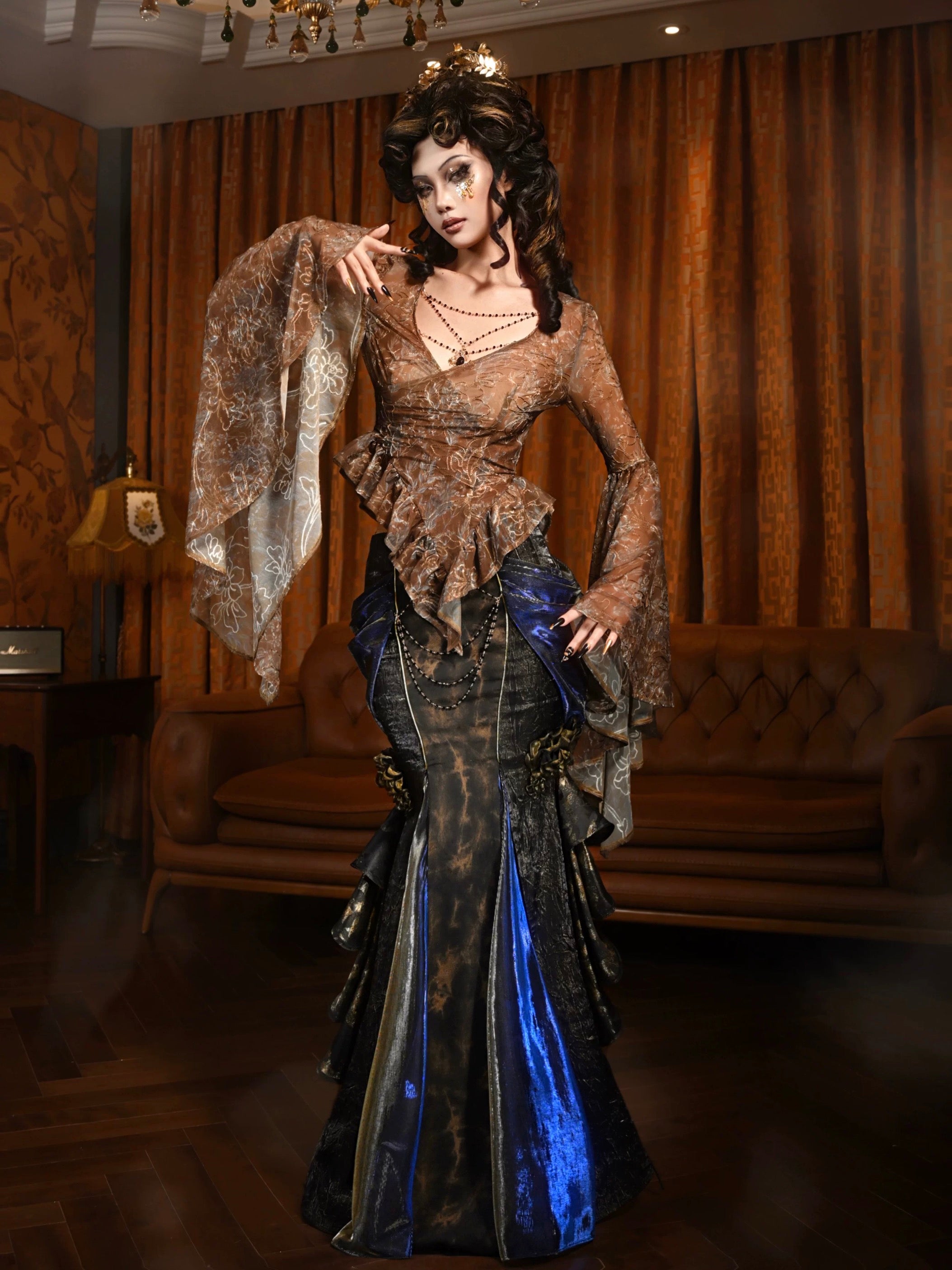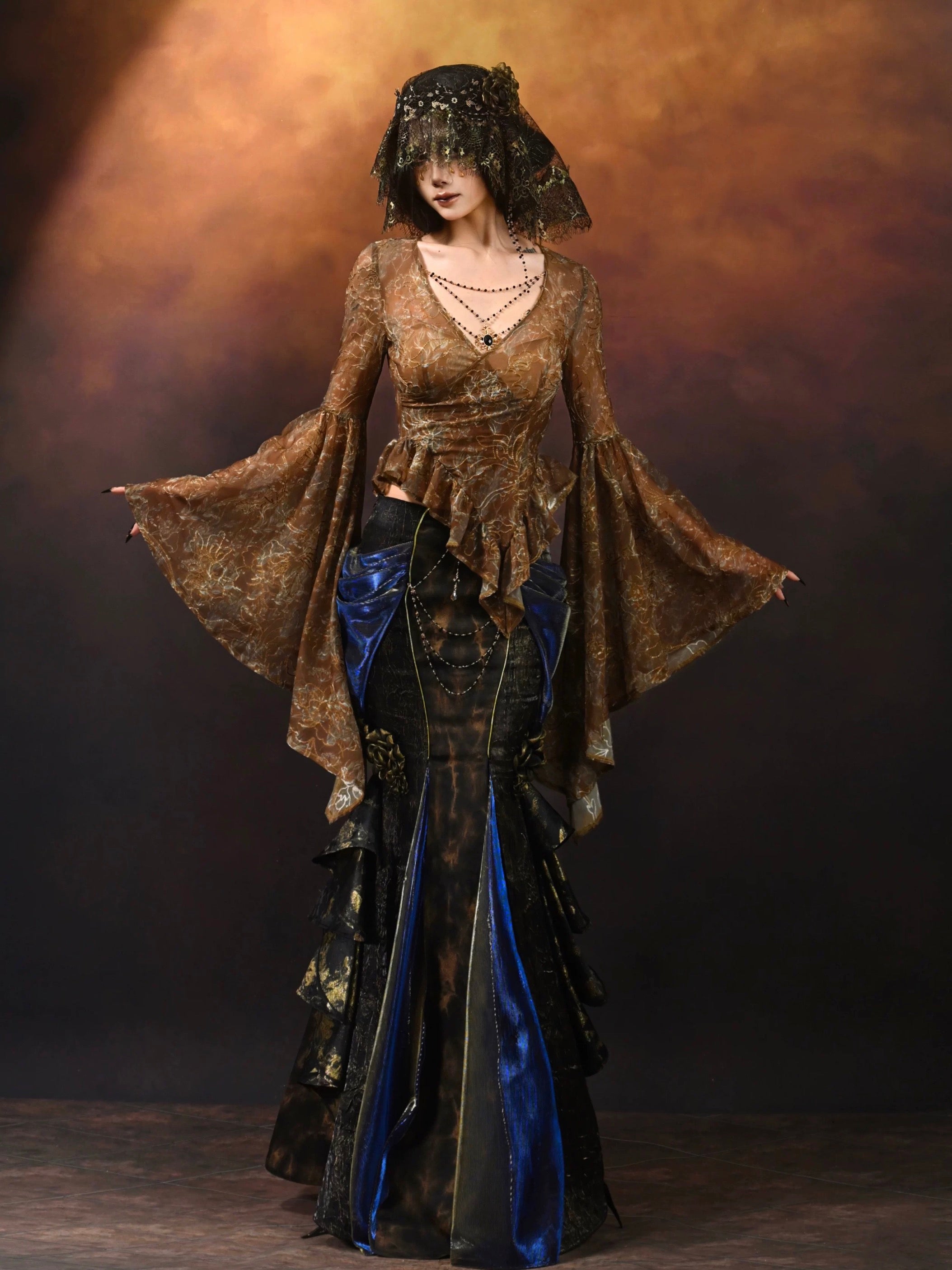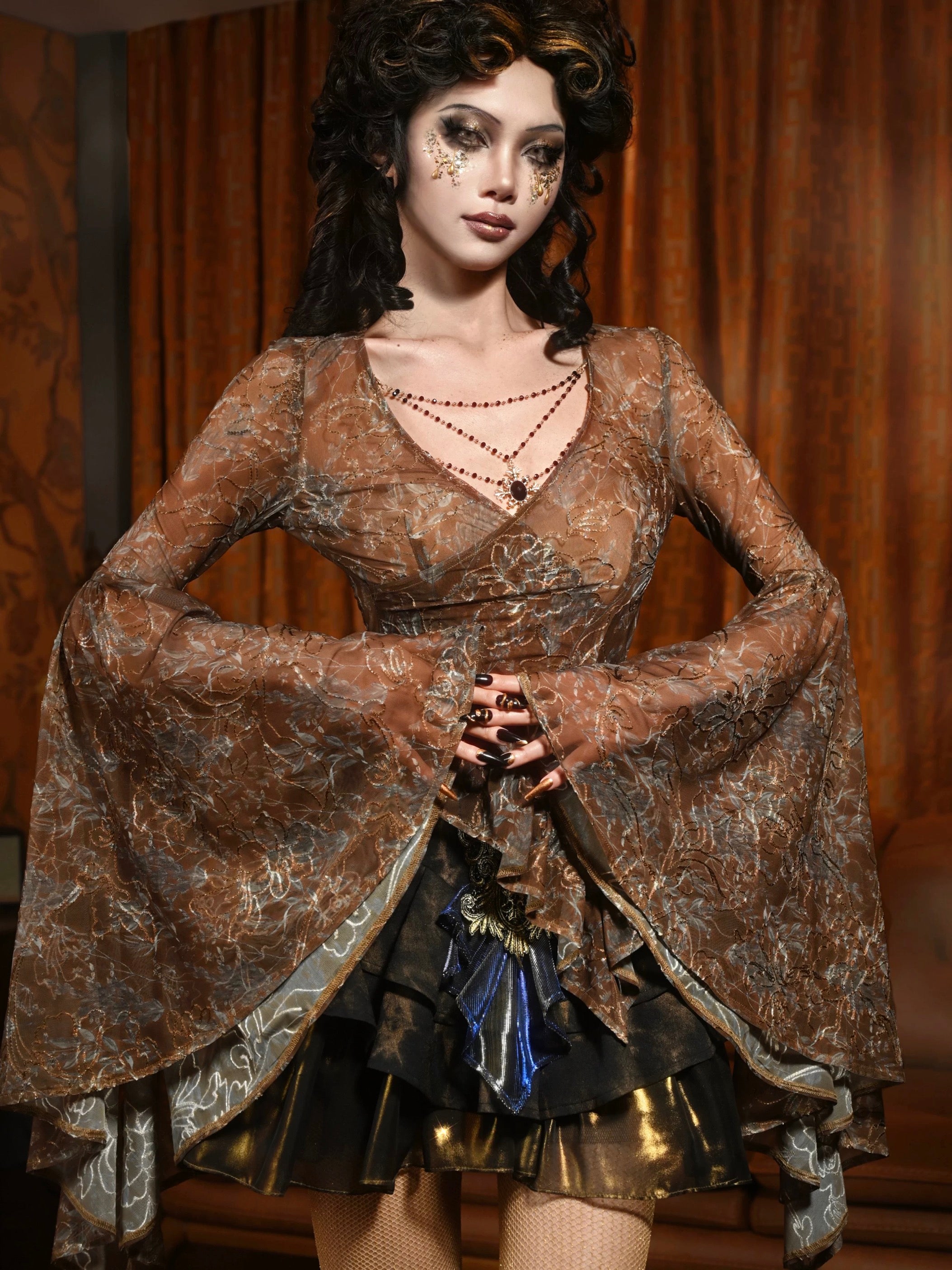 The Blood Supply Golden Hour Baroque Lace Blouse draws inspiration from the warm tones of autumn and the elegance of twilight. Its earthy palette blends shimmering brown and gold, creating a refined yet dramatic look that feels timeless.