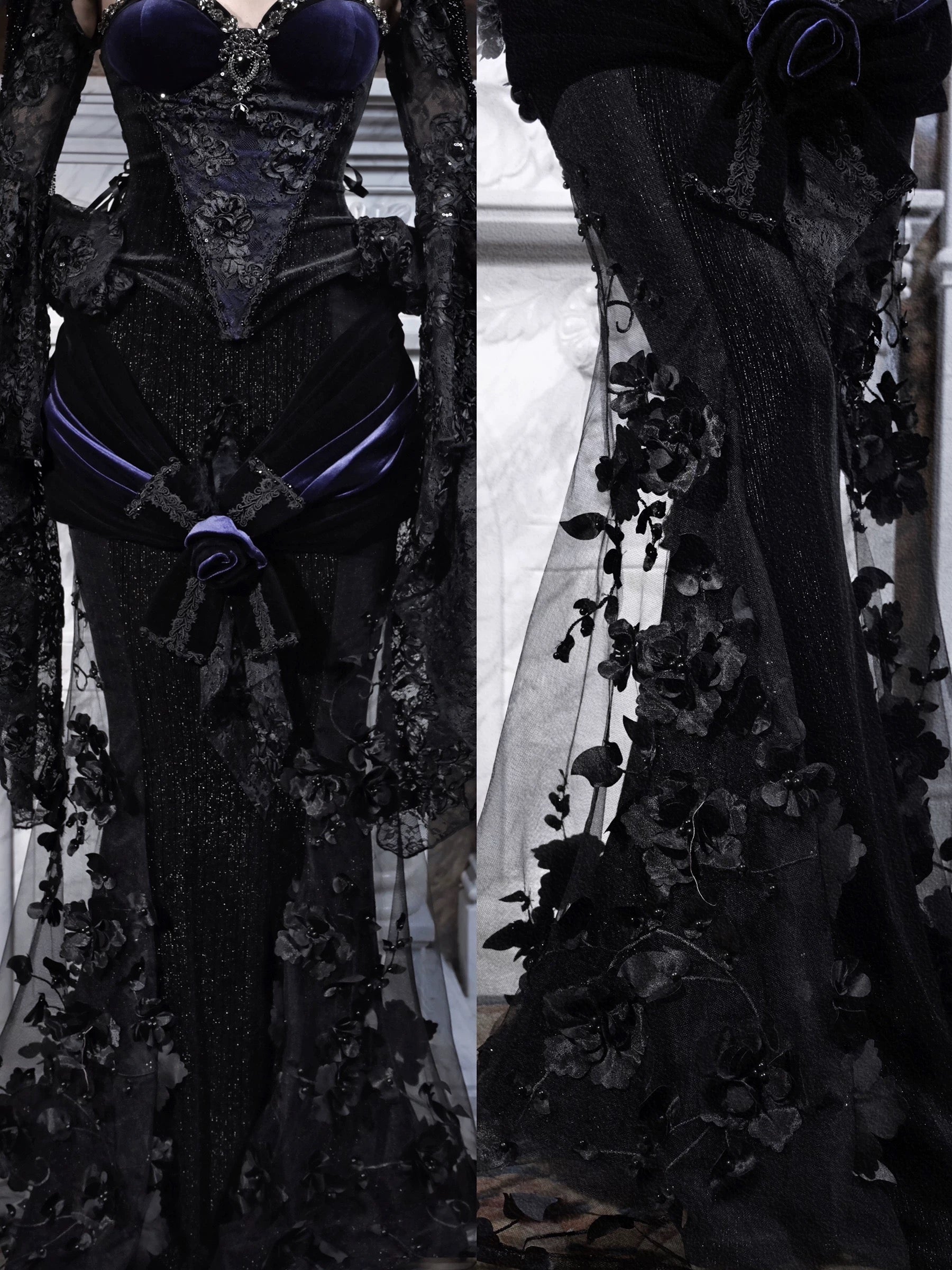 The cascading fishtail skirt ripples like a tide of velvet shadows, adorned with beaded blossoms that climb the sheer overlay like flowers blooming in a graveyard frost. At the hips, sculpted drapery and a velvet rose knot echo the rhythm of funeral procession, balancing sorrow with decadent strength.