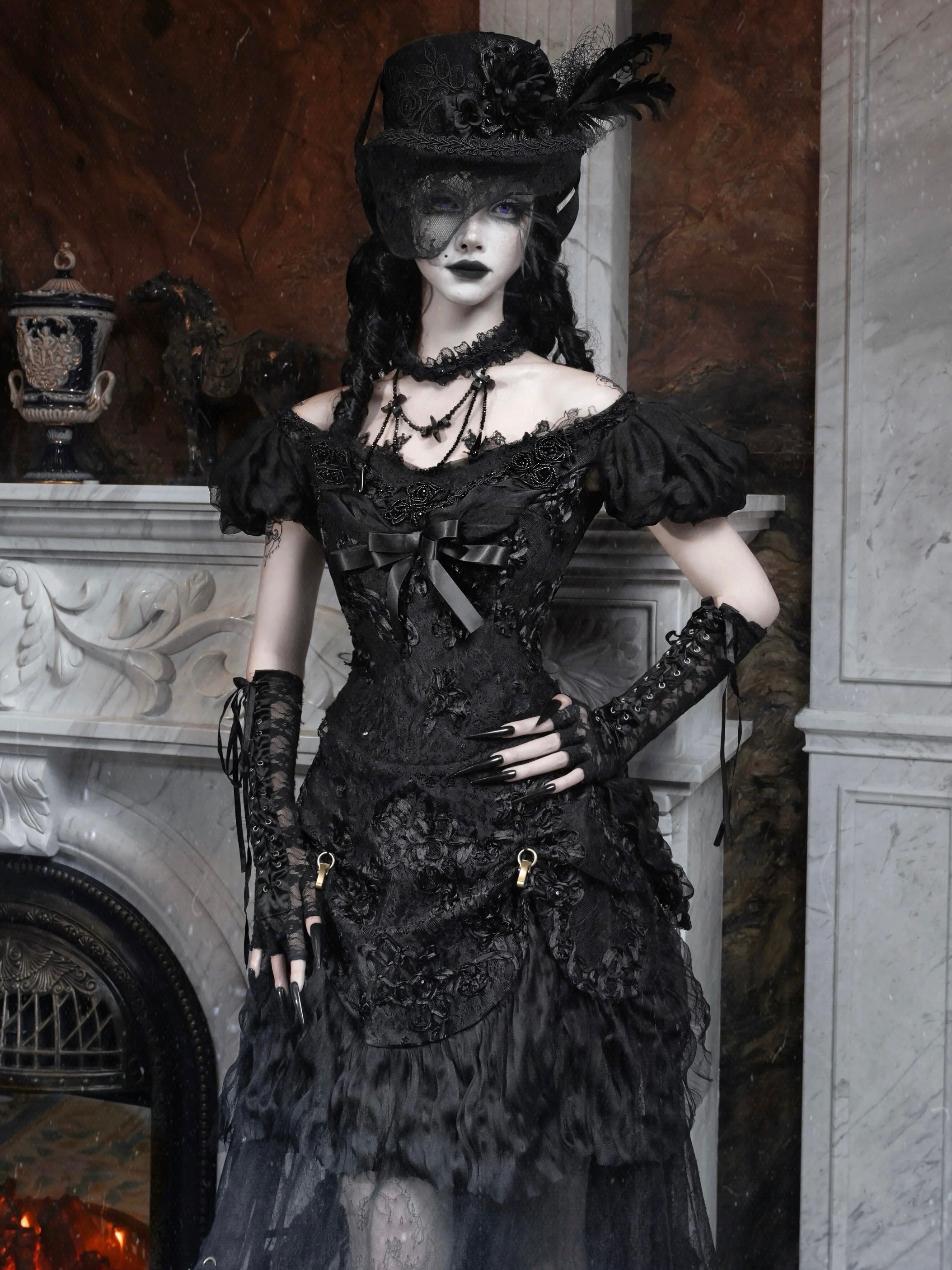 Crafted from black lace and embroidered fabric, it features delicate floral motifs, layered tulle, and a structured silhouette that enhances its antique charm.
