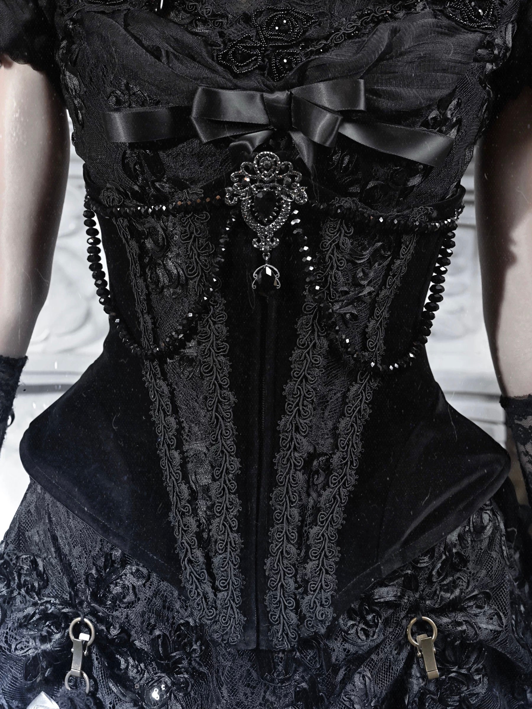 Featuring a front zip for easy wear, dual lace chains, and intricate floral embroidery, the design creates a dramatic silhouette. Detachable chain details and pearl strands add subtle versatility and luminous accents.