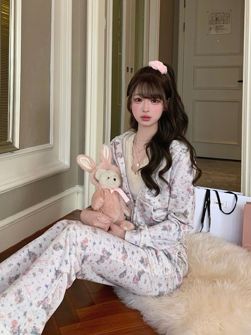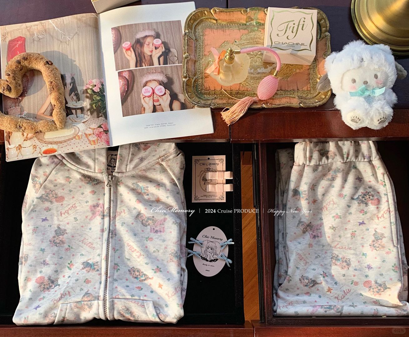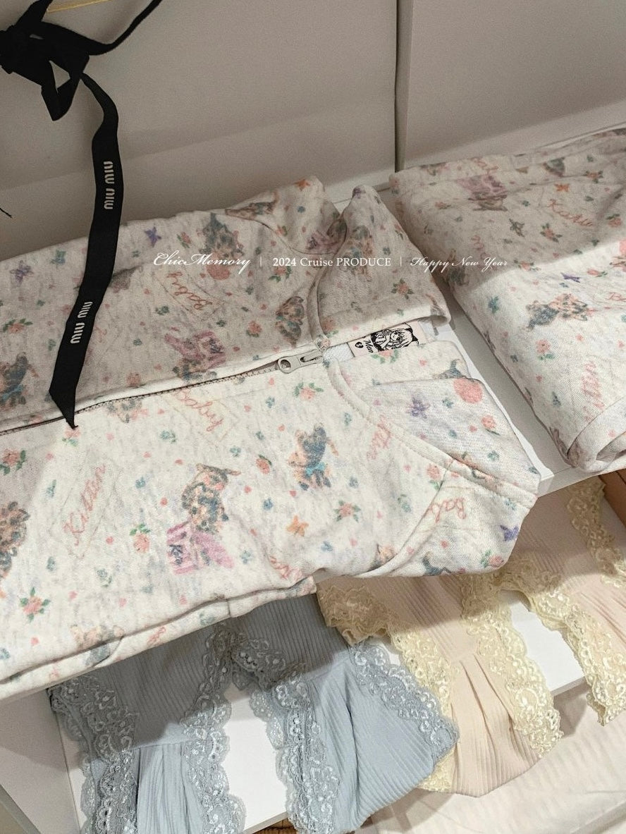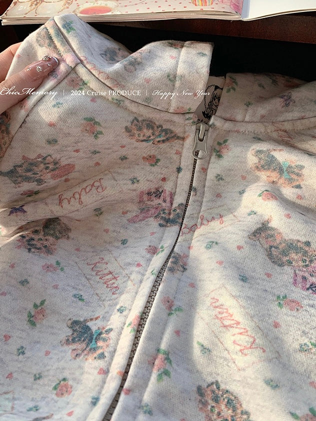 For the soft girl who loves comfort but never sacrifices charm, this adorable cat-print hoodie and sweatpants set is the perfect mix of cozy loungewear and delicate coquette style. Inspired by vintage Japanese prints, the soft gray base color features a subtle textured effect for a more refined, dreamy aesthetic.