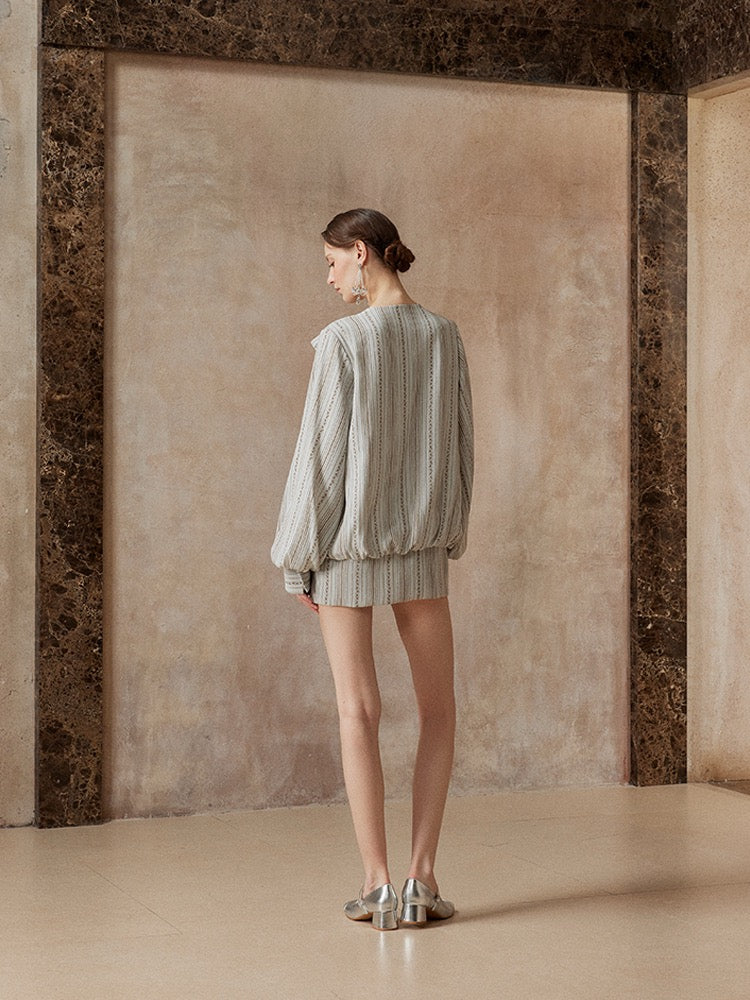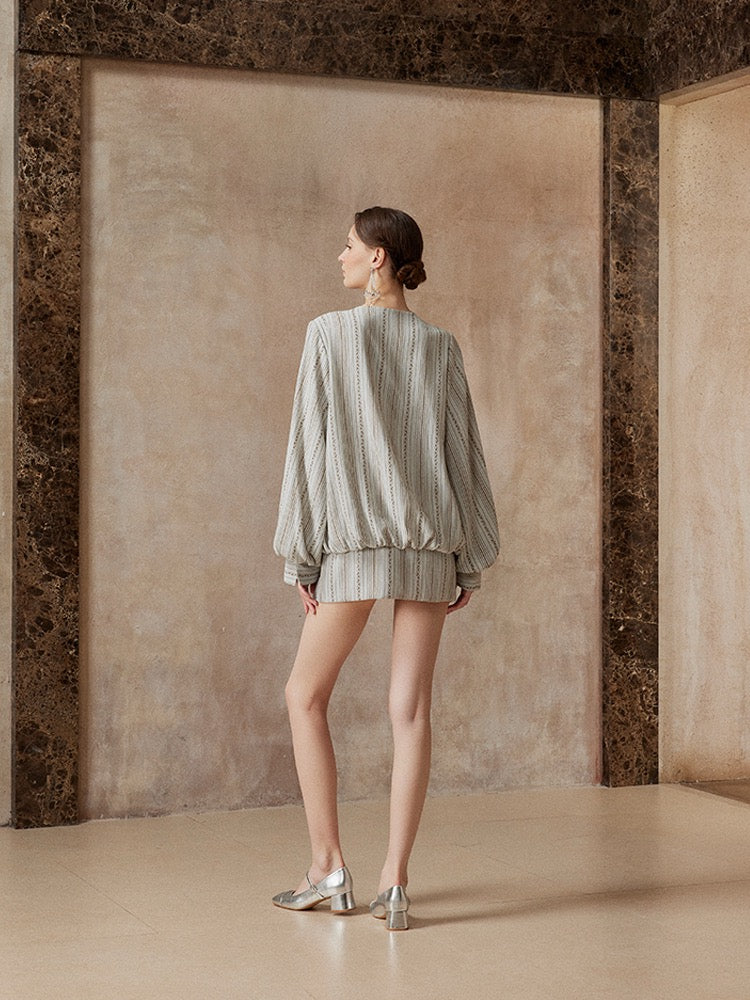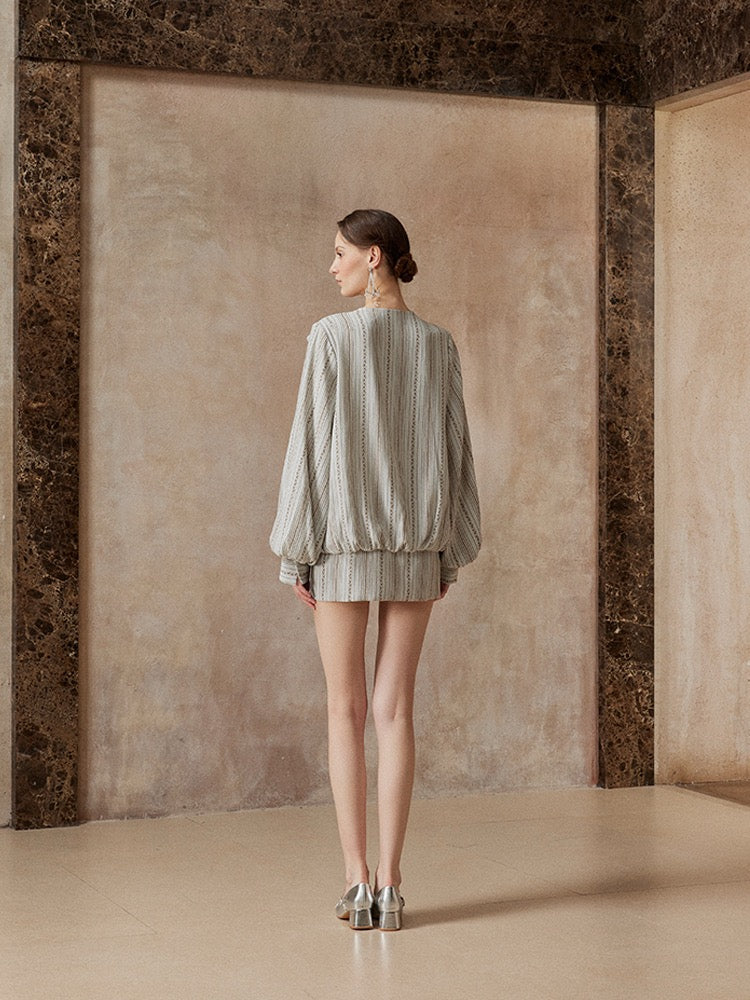 A dreamy shirt dress that feels like a soft melody under the moonlight. Designed with billowing sleeves, a graceful bow-tie neckline, and a relaxed silhouette, it blends elegance with ease. The subtle striped fabric shimmers like silver shadows, creating a timeless charm that moves with every step.