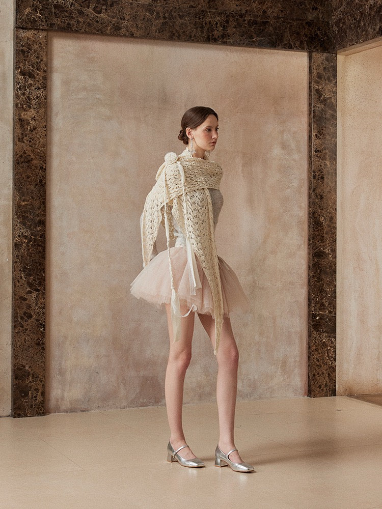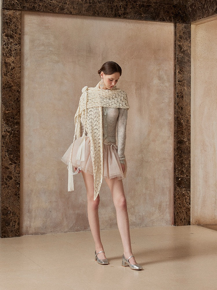 A soft whisper of moonlight woven into fabric — this ethereal shawl drapes gracefully over your shoulders or wraps delicately around your neck. Crafted with a lace-like knit, it floats with a weightless charm, evoking the elegance of a ballet veil drifting under silver light.