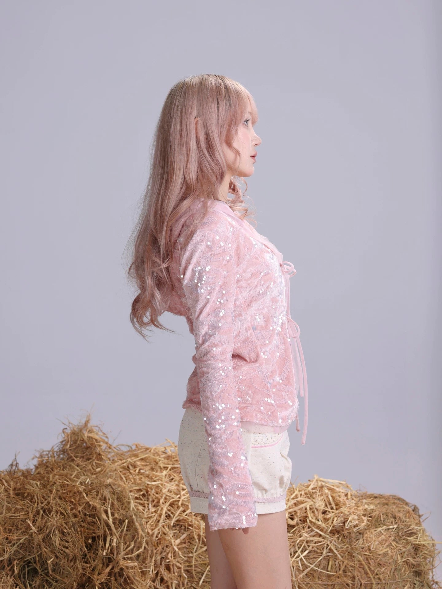 Person wearing a pink sequin hoodie inspired by skins Cassie outfits style