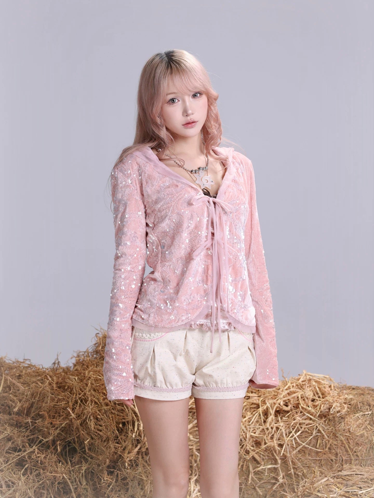 It’s sparkly… soft, and a little see-through like angel shell. The velvet catches the light, and sequins shimmer like tiny stars when you move. ✧