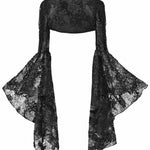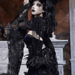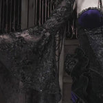 Shrouded in sorrow and grandeur, the Beaded Lace Cape emerges as a ceremonial relic from Blood Supply’s Moon Funeral collection. Sweeping the princess sleeves style (I would call that Queen) unfurl like mourning veils, their lace embroidered with roses that seem to bloom in the twilight.