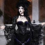 Hand-sewn beading cascades across the sleeves in dark rivulets, shimmering faintly like frost on gravestones. The structured fit and lace-up back frame the silhouette with solemn elegance, designed to layer seamlessly over corset gowns.