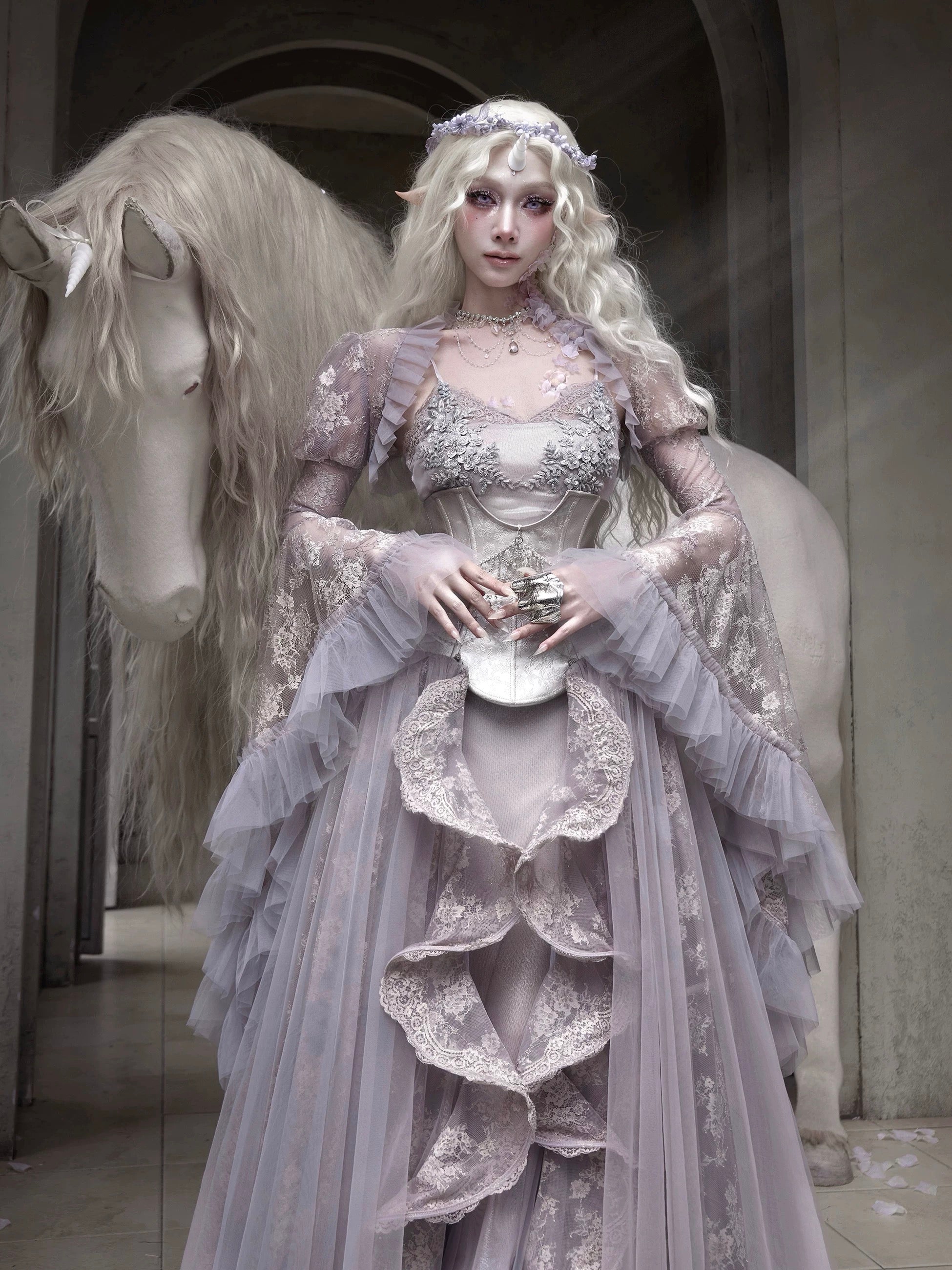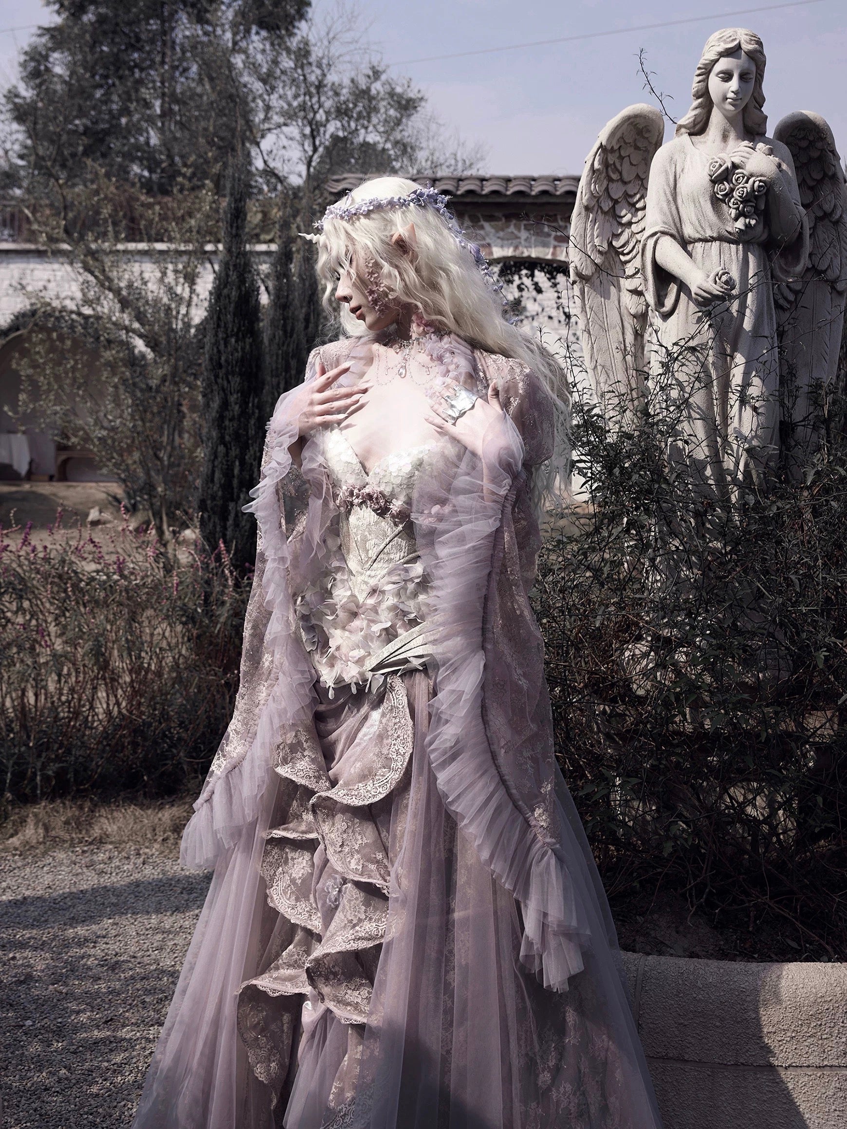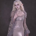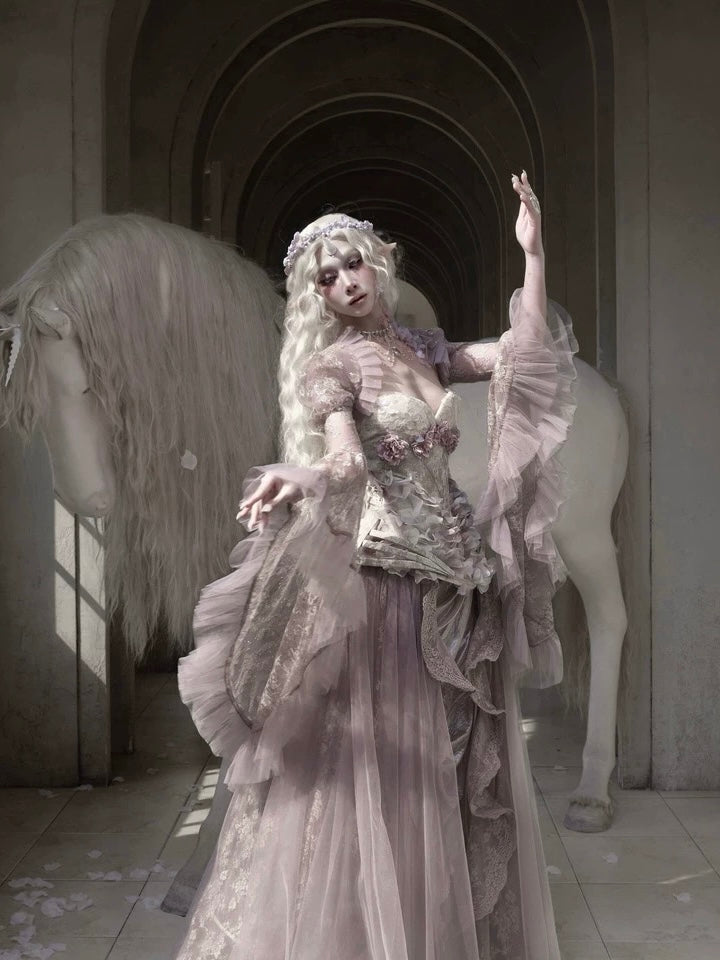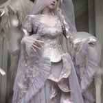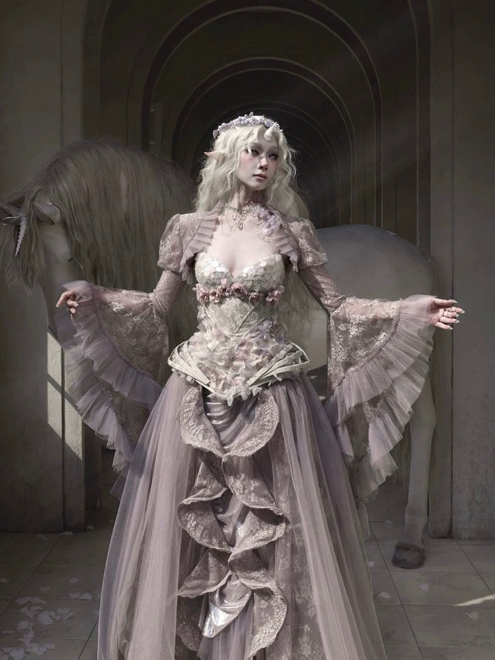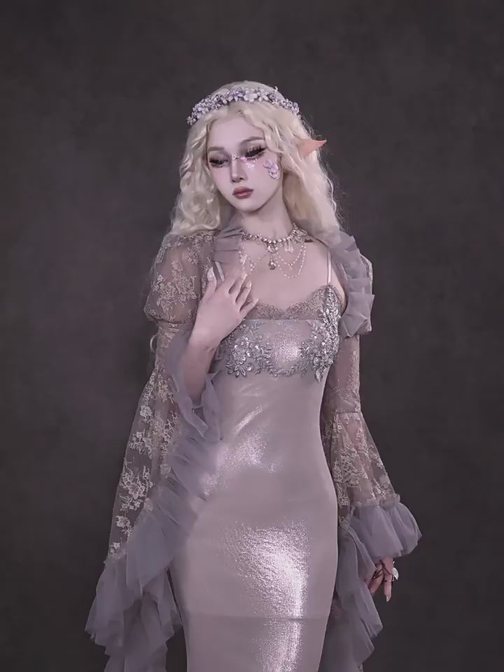 Soft translucent lace creates a dreamy silhouette, while flowing sleeves move like mist around the body. The delicate textures add a romantic elven atmosphere, blending vintage elegance with fairy-like grace.
