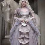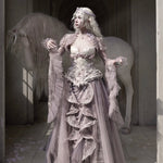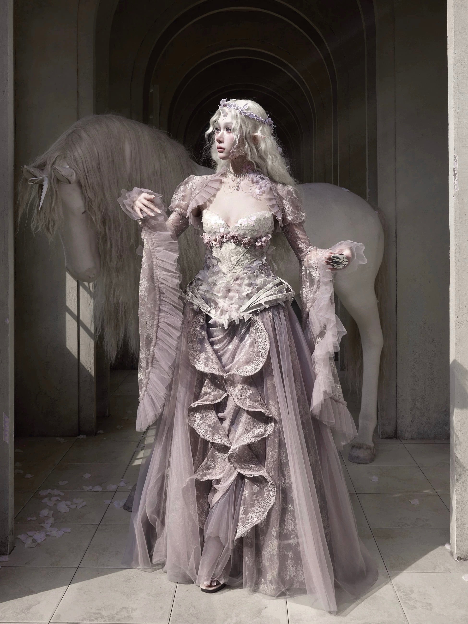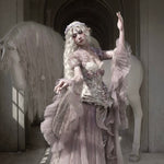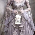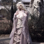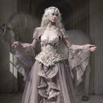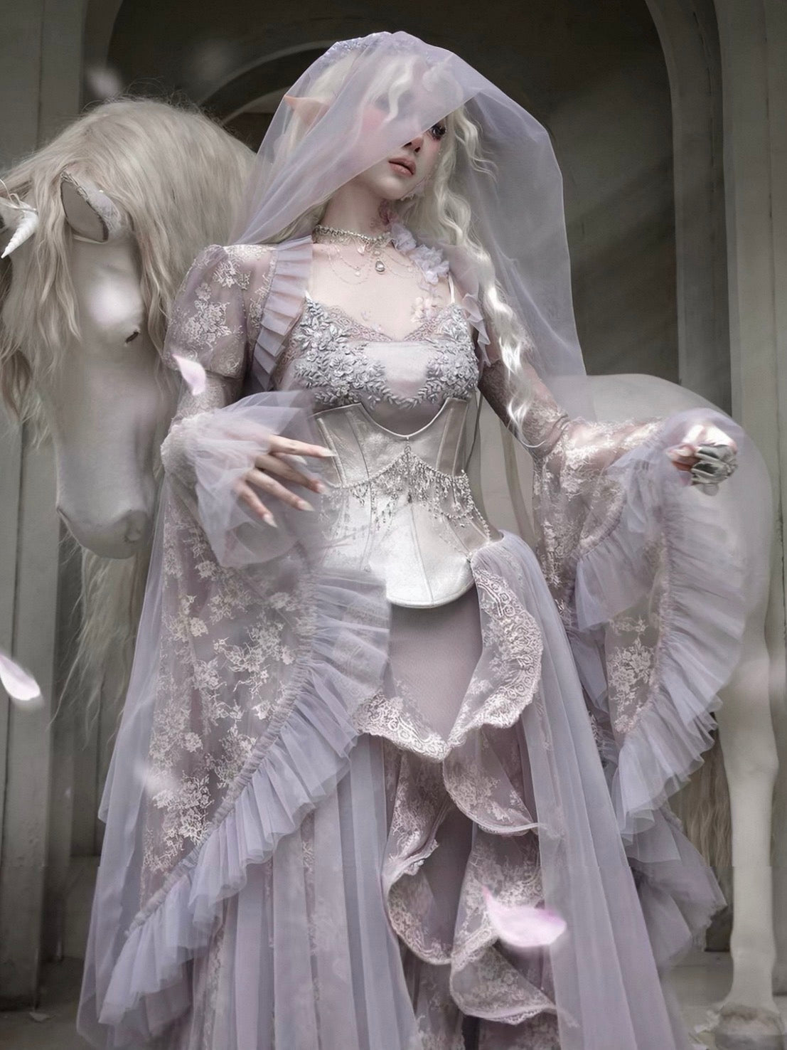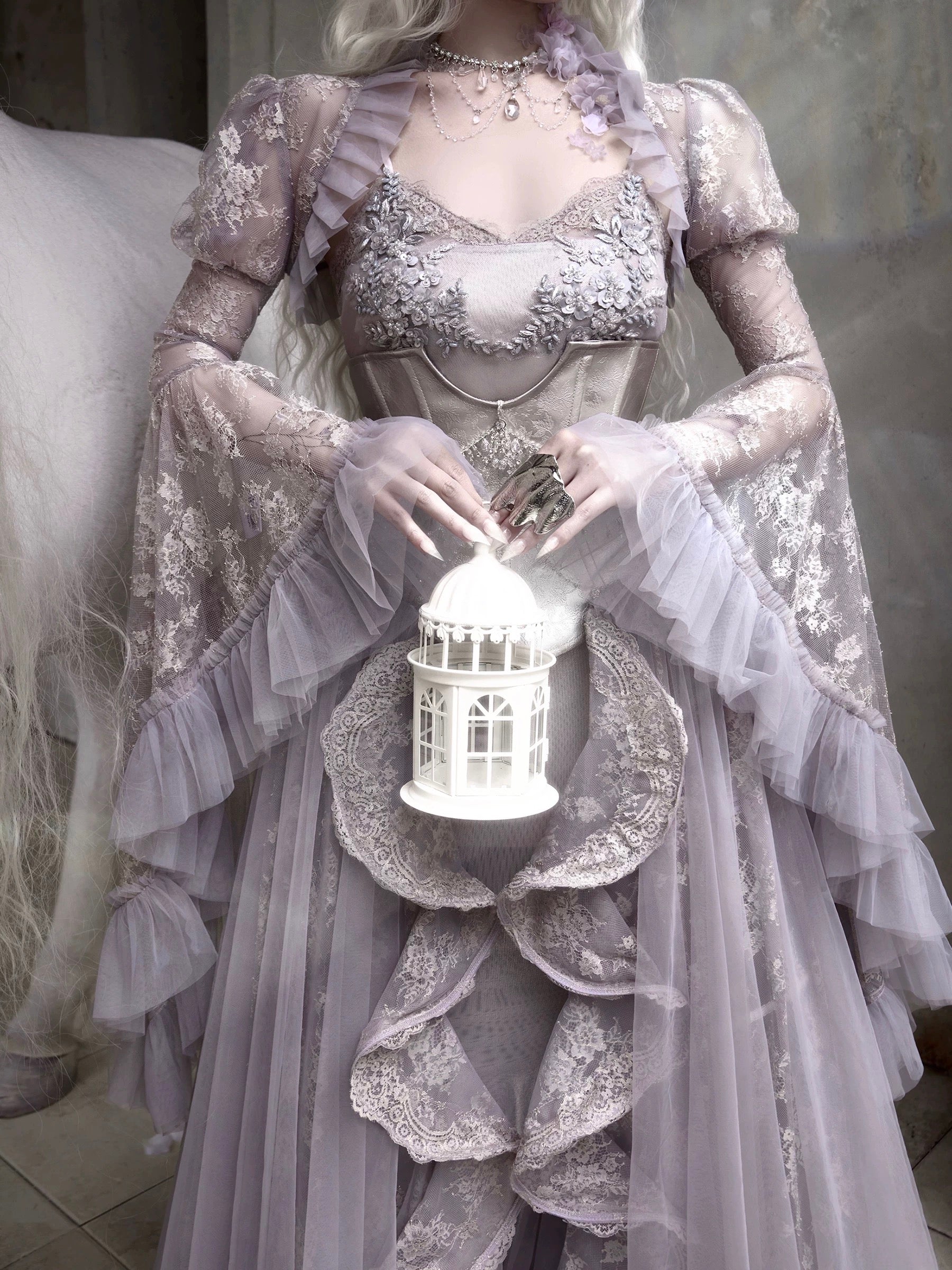 Soft translucent lace creates a dreamy silhouette, while flowing sleeves move like mist around the body. The delicate textures add a romantic elven atmosphere, blending vintage elegance with fairy-like grace.