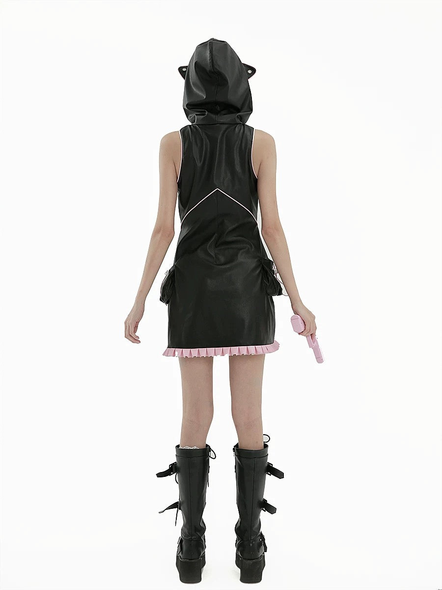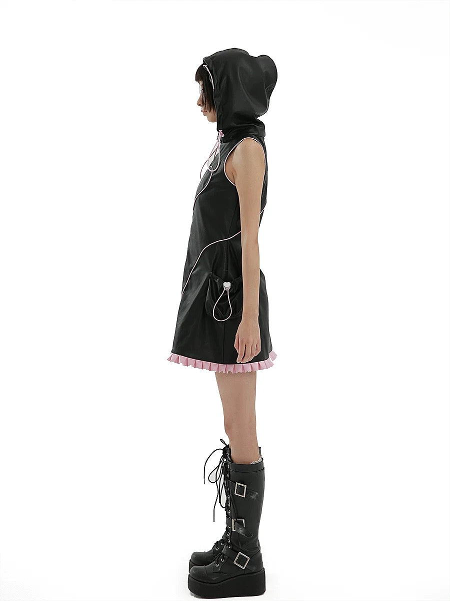 Made from sleek faux leather with contrasting pastel-pink piping, this sleeveless A-line design features a bold heart-shaped front seam, pleated hem, and a playful cat-ear hood for that signature e-girl charm. Functional side pockets with drawstring details add a utilitarian twist, making it perfect for jirai-kei outfits, cosplay events, Halloween looks, or edgy everyday styling.