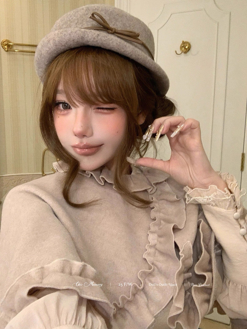 Design highlights: ruffle collar, flowing hemline, detachable satin bow, soft wool texture