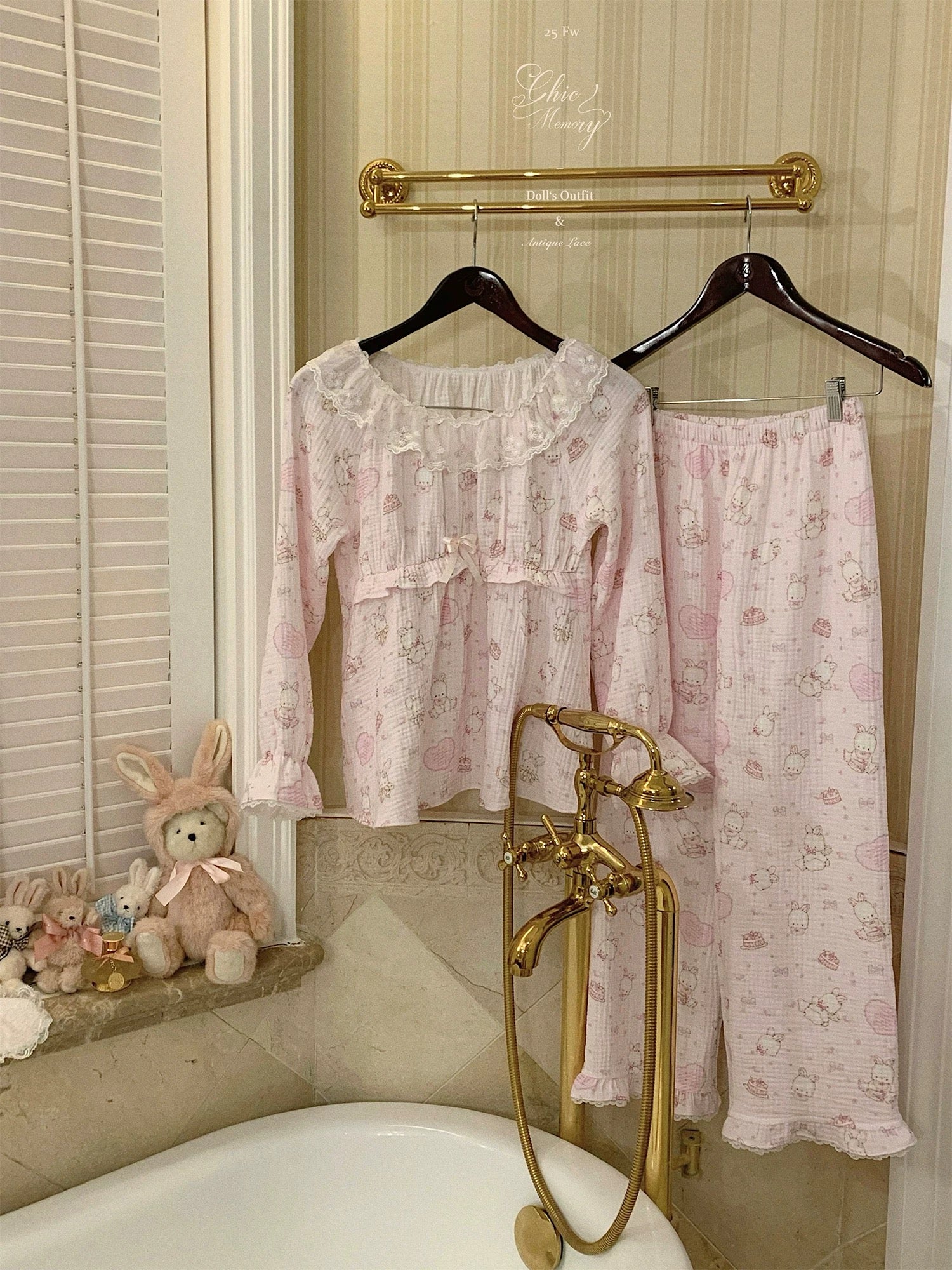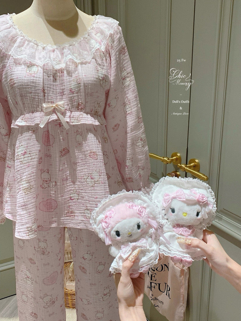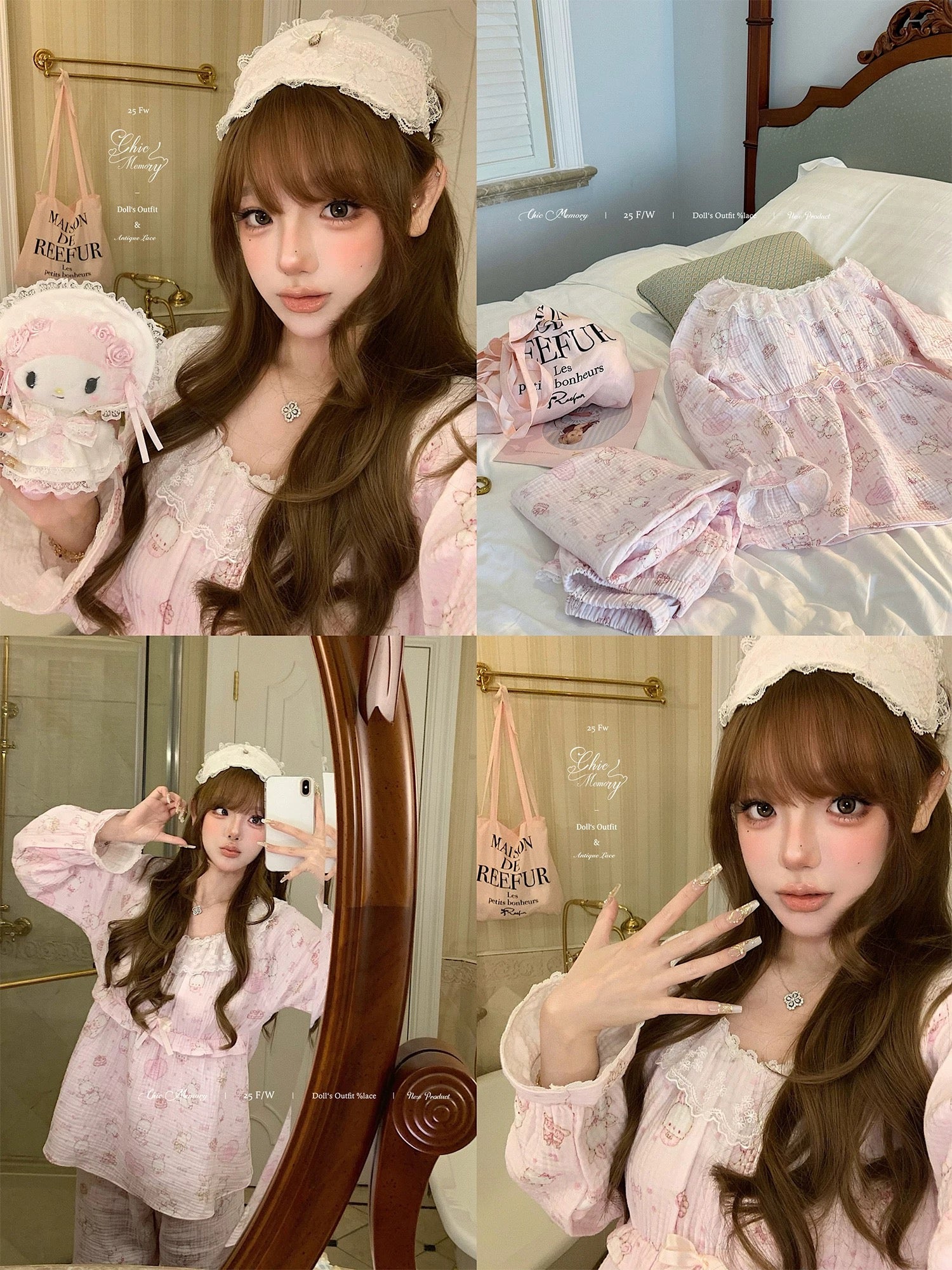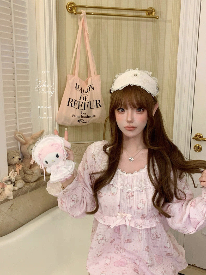 Delicate lace trims, puffed sleeves, and tiny ribbons create a dreamy doll’s sleepwear mood that’s both adorable and timeless.