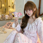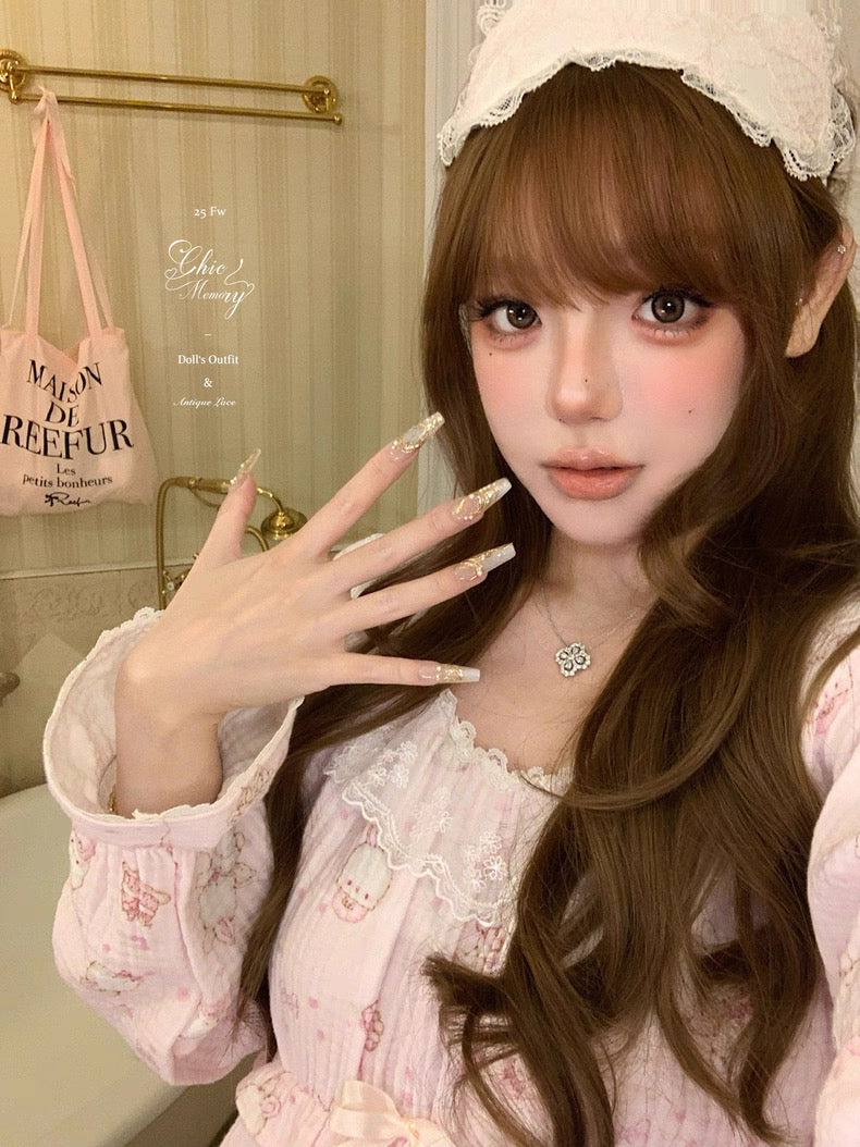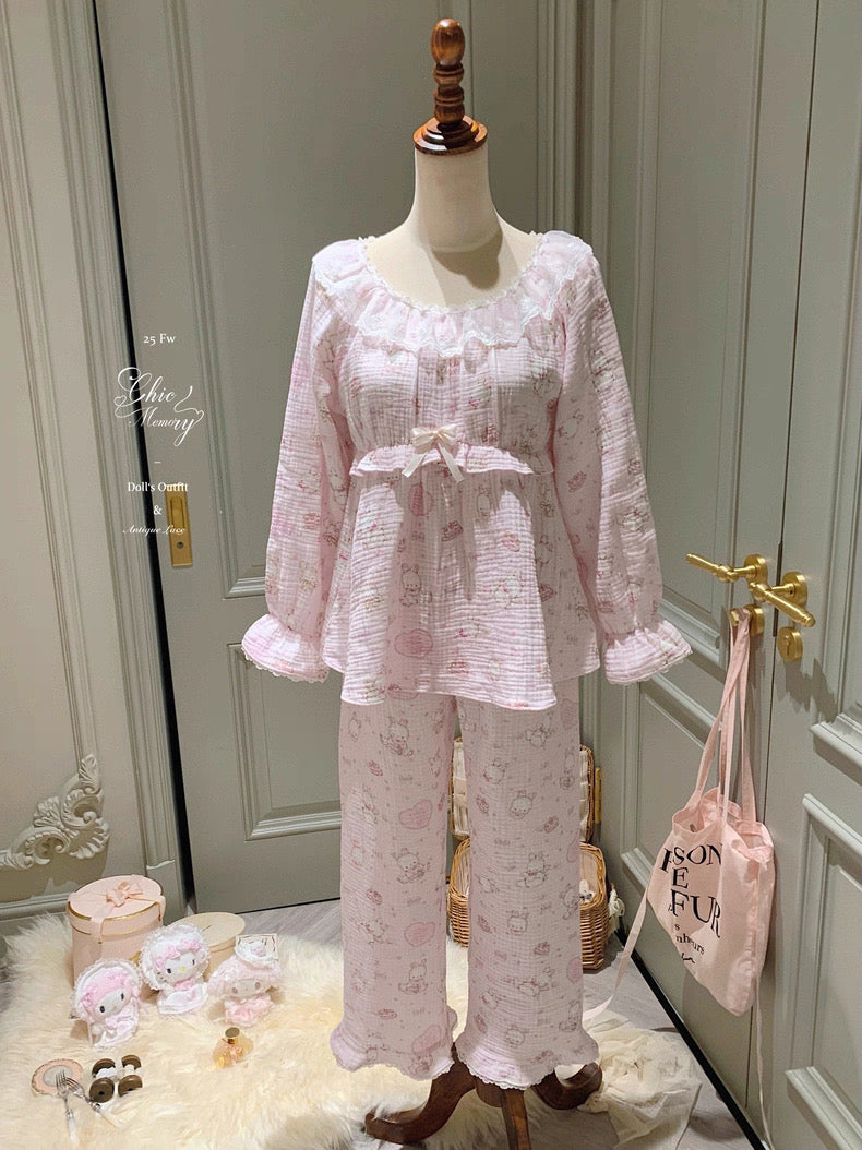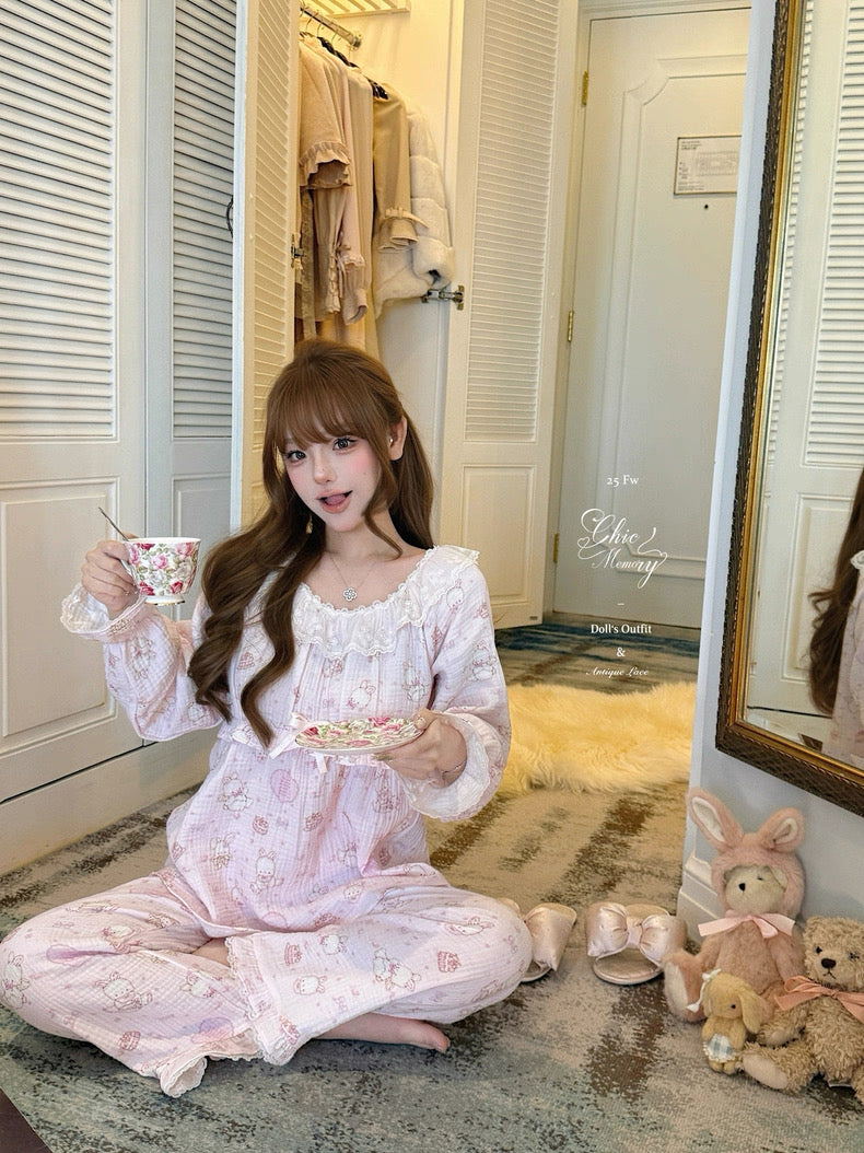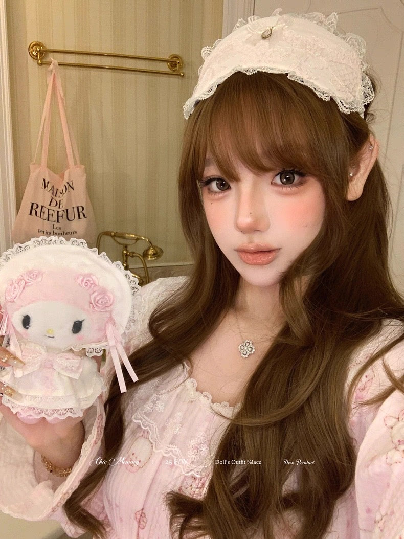 Delicate lace trims, puffed sleeves, and tiny ribbons create a dreamy doll’s sleepwear mood that’s both adorable and timeless.