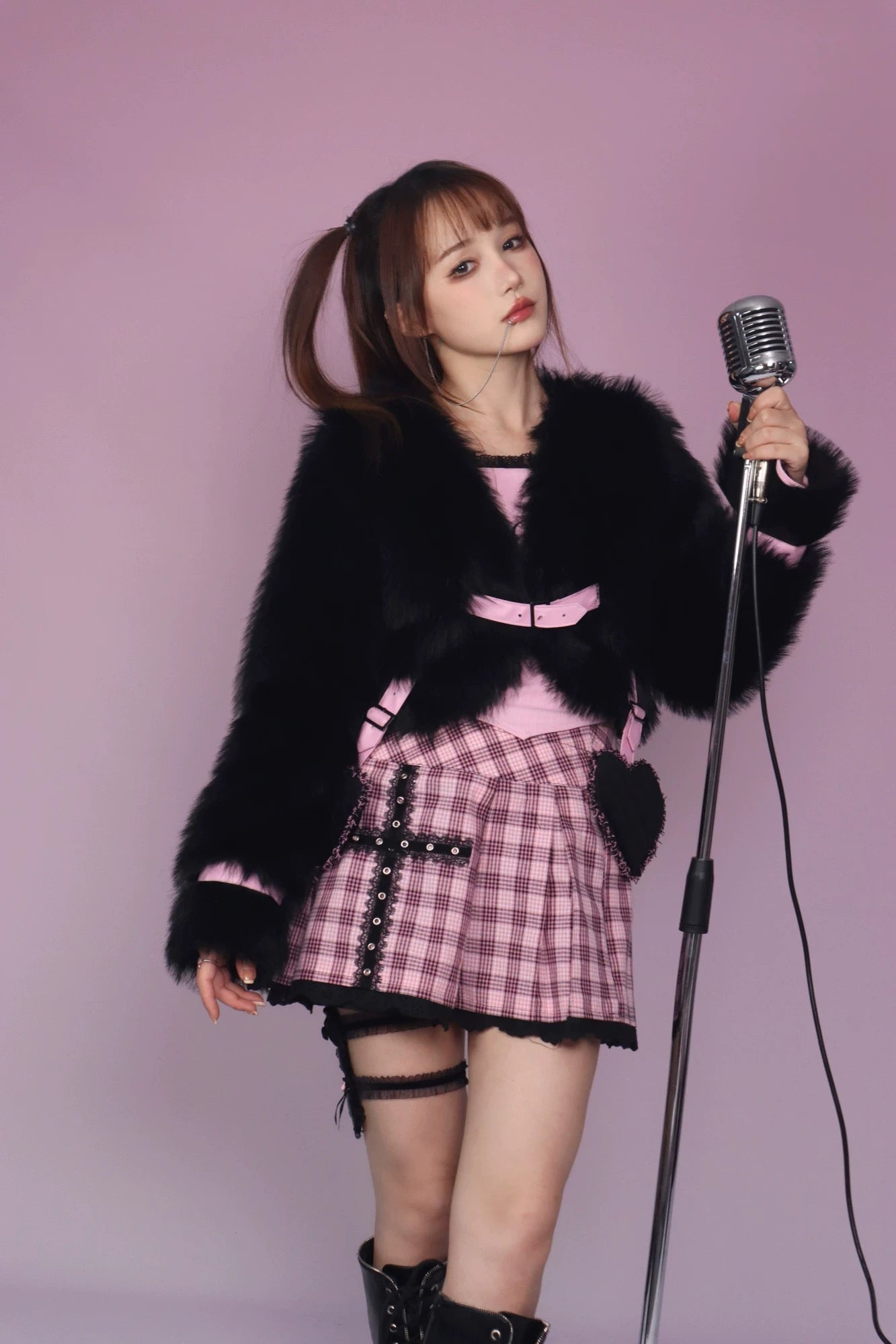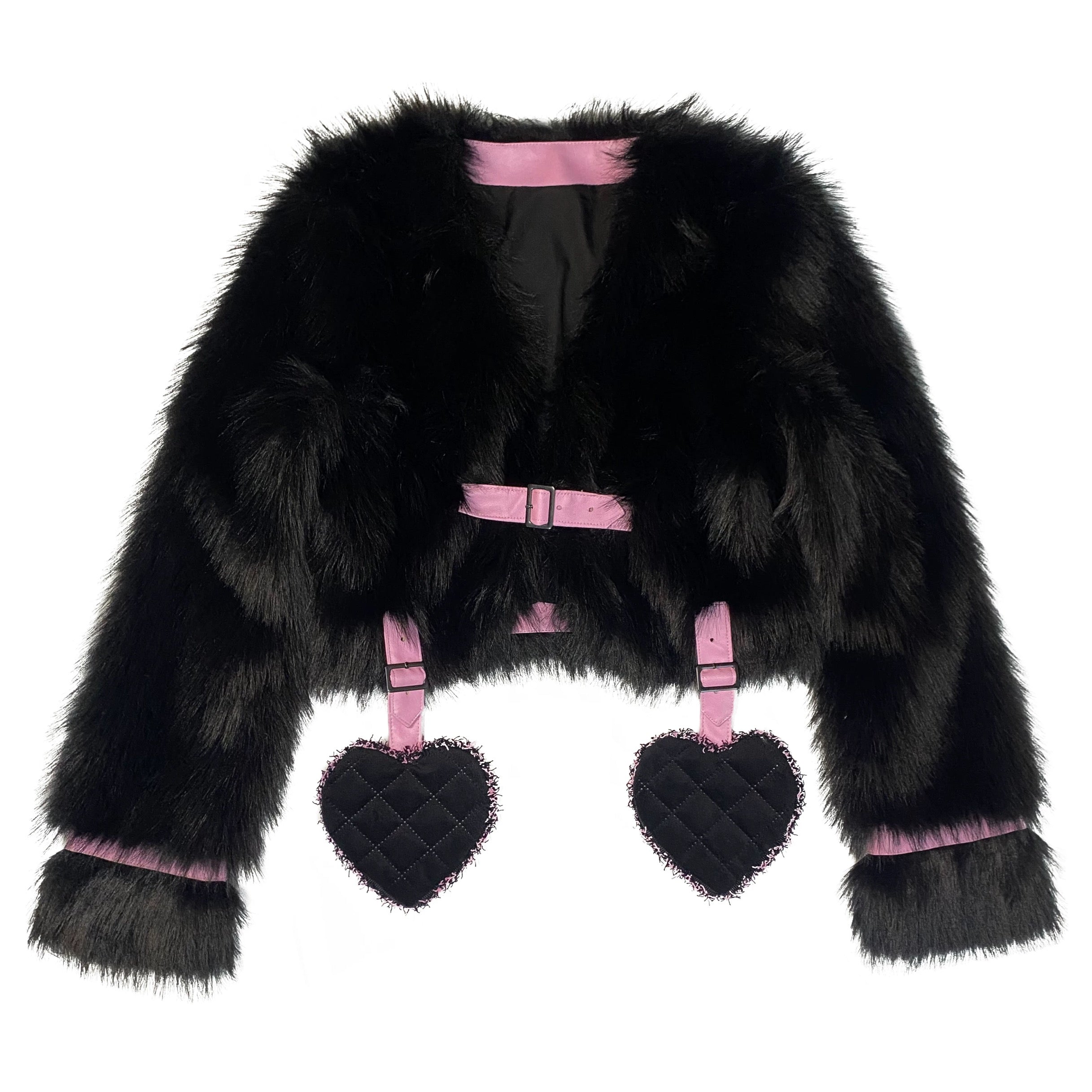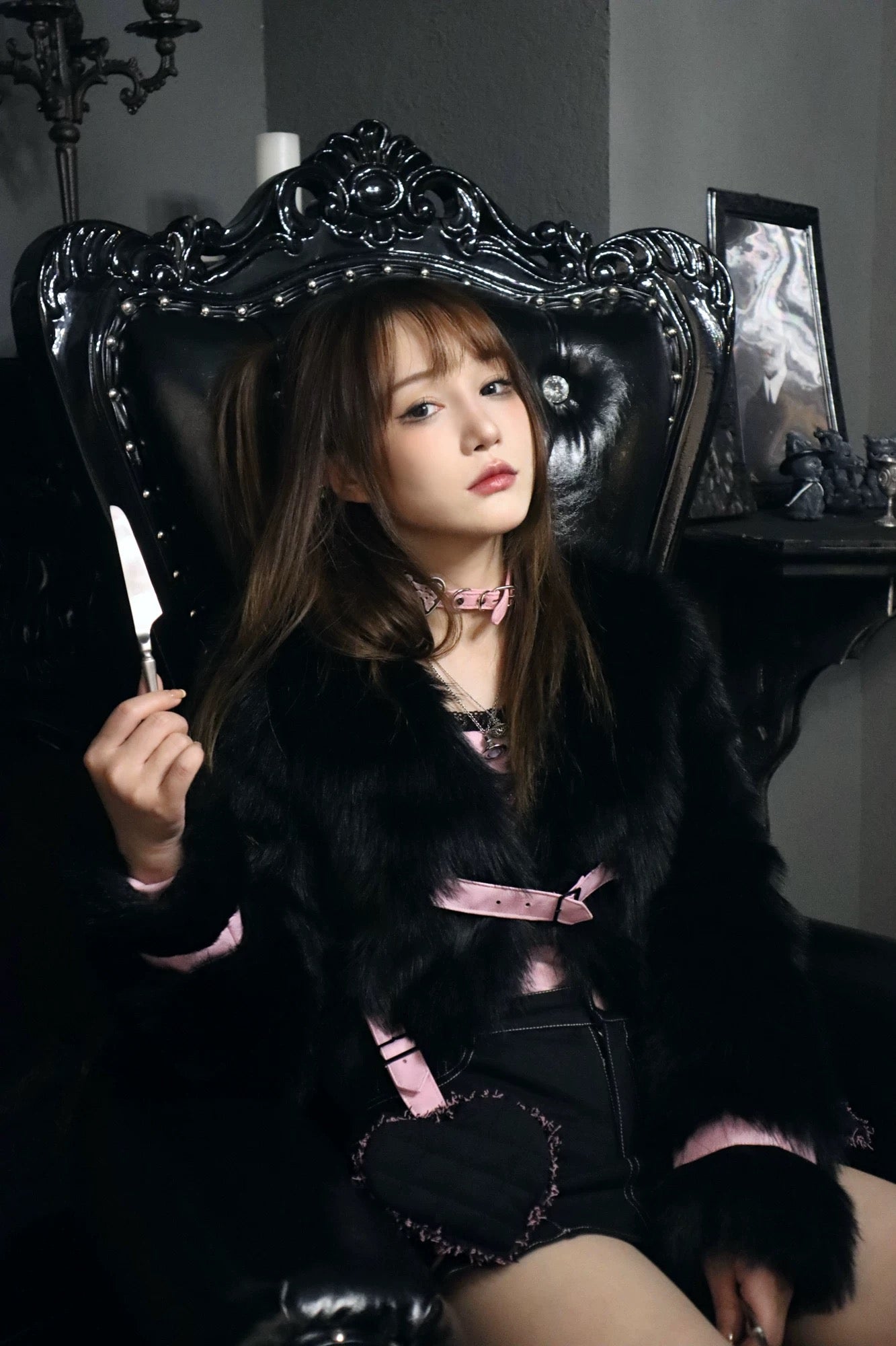 Step into the winter stage with the Evil Tooth Velvet Heart Punk Fur Jacket, a statement piece blending dark gothic charm with sweet, playful details. Crafted from premium faux fur, this cropped jacket is accented with bubblegum-pink straps and detachable quilted heart charms, creating a bold contrast between rebellion and cuteness.