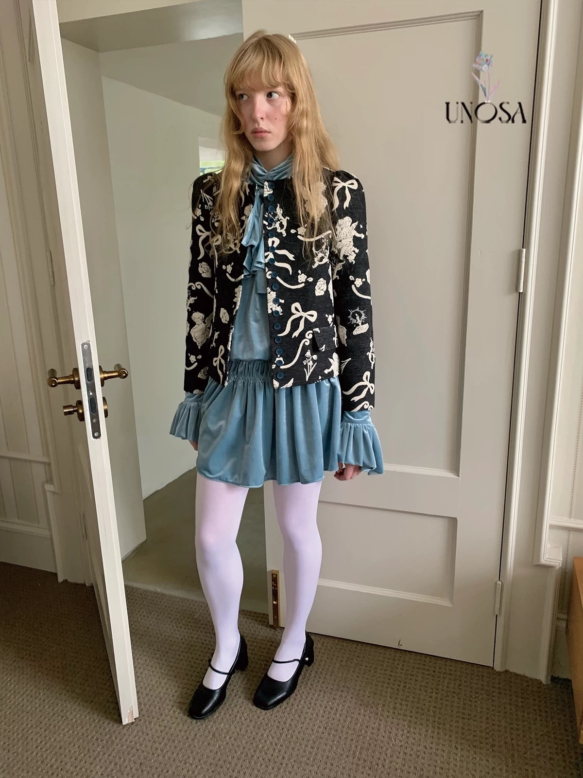 Style keywords: French vintage jacket · black and white jacquard · elegant coquette outfit · romantic winter style · Parisian aesthetic
