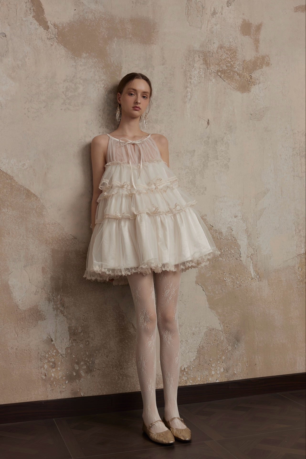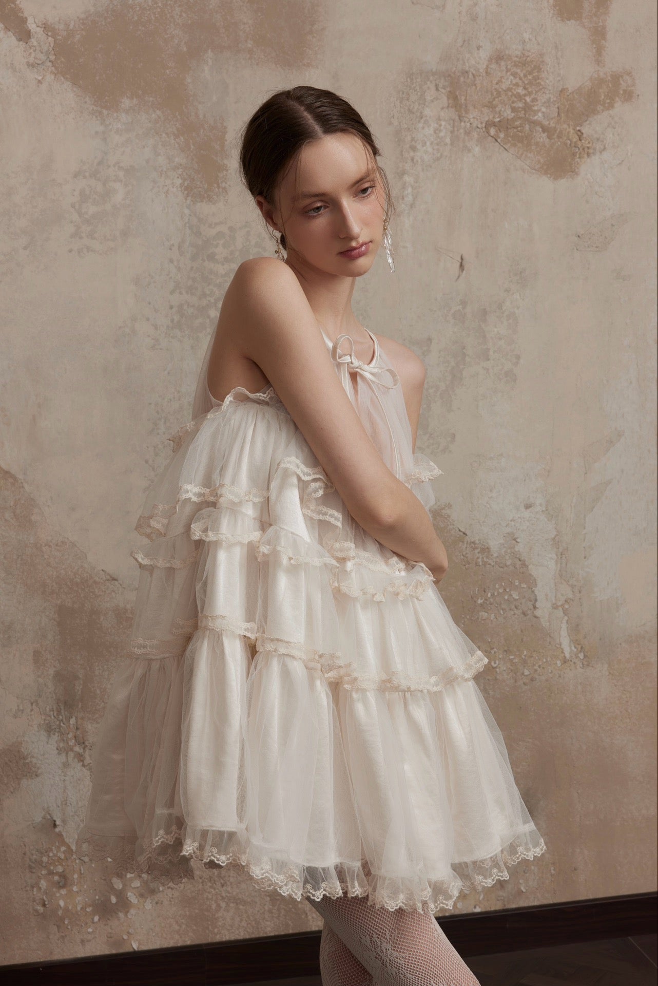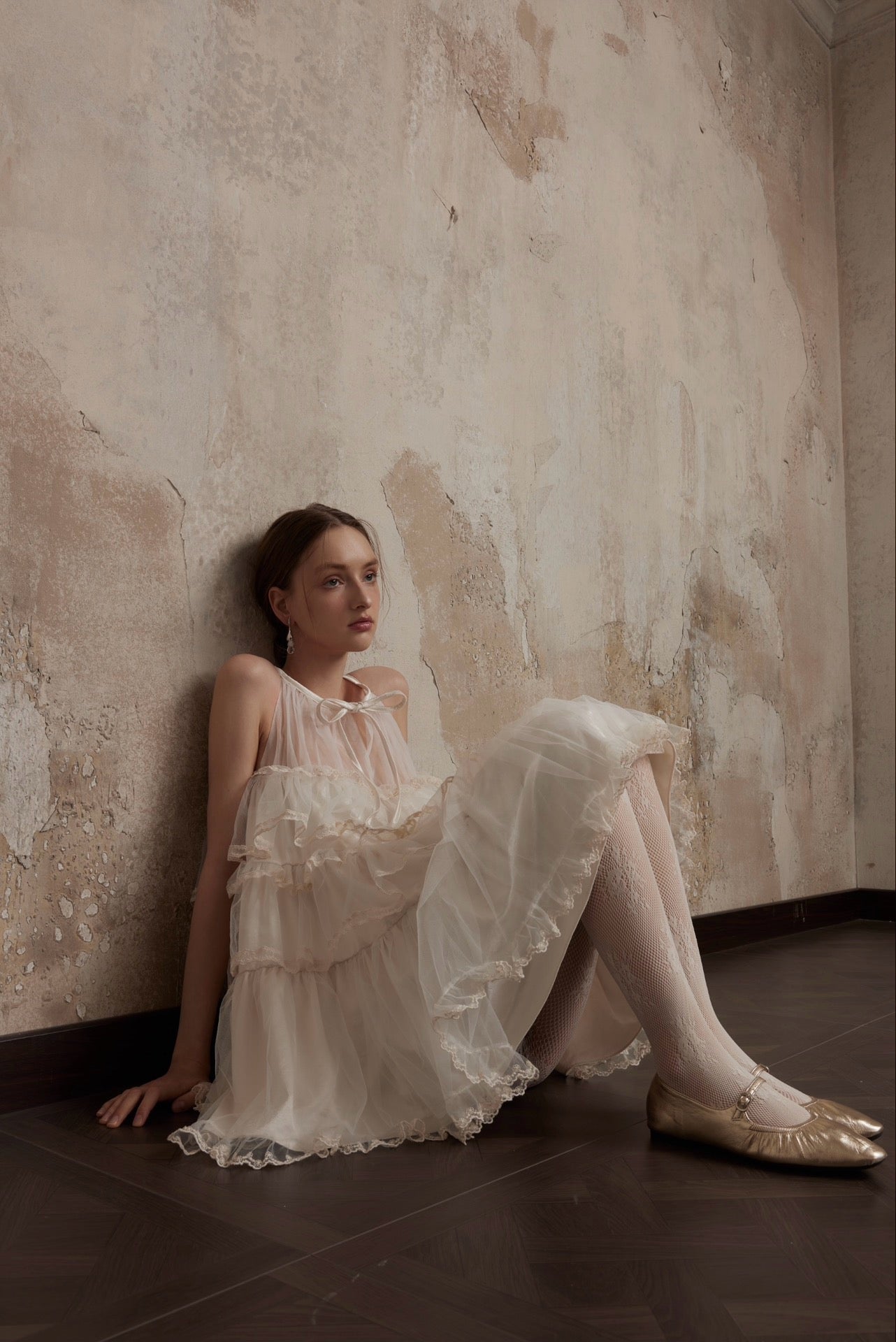 A dreamy, fairytale-inspired dress that flows like a delicate melody, reminiscent of an enchanted ballet performance. Featuring soft layers of shimmering tulle, elegant lace trims, and a romantic ribbon tie, this dress is perfect for those who love a touch of magic in their wardrobe.
