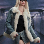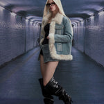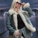 Urban vintage street-style glam with the Retro Luxe Faux Fur Denim Coat. Crafted from washed denim and trimmed with plush faux-fur along the collar, cuffs, and hem, this jacket blends retro Y2K energy with cozy autumn–winter warmth.