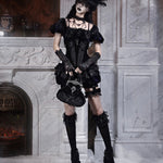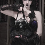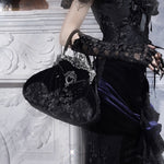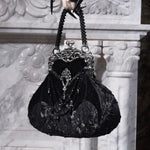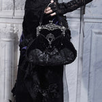 The ornate silver frame, carved in heavy relief, crowns the bag with medieval grandeur, while the beaded handle and jet-black crystal accents add a touch of solemn radiance. Handcrafted lace trims and delicate appliqués bring the silhouette to life, echoing the wings of a funeral moth.
