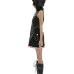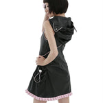 Made from sleek faux leather with contrasting pastel-pink piping, this sleeveless A-line design features a bold heart-shaped front seam, pleated hem, and a playful cat-ear hood for that signature e-girl charm. Functional side pockets with drawstring details add a utilitarian twist, making it perfect for jirai-kei outfits, cosplay events, Halloween looks, or edgy everyday styling.