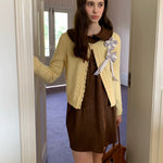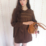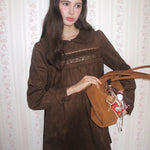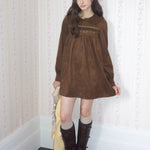 Inspired by classic babydoll design, the Autumn Fawn Babydoll Dress features a sweet A-line shape with a gently raised waistline to create a soft and cottage core feeling. The pleated collar and delicate lace details add vintage charm, while the suede-touch fabric offers warmth and comfort — perfect for autumn days.