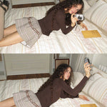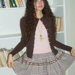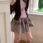 Wrapped in warm cocoa and soft blush tones, this plaid mini skirt blends vintage charm with playful sweetness. The A-line silhouette flares gently with each step, while a satin ribbon trim adds a dainty, girlish detail. Built-in shorts keep you comfortable and carefree, perfect for twirling through bookshops or enjoying café afternoons.
