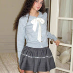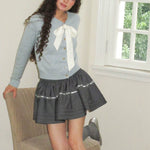 Soft as a snowflakes in winter wonderland — this pastel blue cardigan wraps you in gentle warmth and quiet elegance. The satin ribbon bow ties delicately at the collar, adding a touch of dreamy femininity to the relaxed wool-blend knit. Finished with gold-tone buttons and a slightly cropped silhouette, it pairs beautifully with pleated skirts or wool shorts for that classic MineBeThyVers charm.