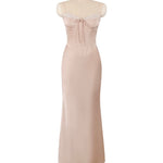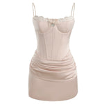 The Tokyo Love Story Dress captures the delicate poetry of pastel evenings and soft light. Crafted in a muted blush satin, it features a corset-inspired bodice adorned with lace trim and a gentle bow detail at the neckline.