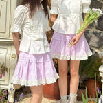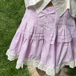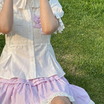 Soft as a spring breeze and sweet like a melody 🎵 The Lavender Melody Cotton Skirt is a coquette dream come true, featuring delicate lavender stripes, double pleated layers, and a scalloped white lace hem that adds a gentle vintage charm. A satin ribbon bow and dainty front buttons complete the look with a touch of babydoll romance.