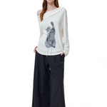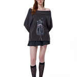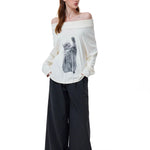 A playful twist on classic comfort — this off-shoulder top by Reabobo.co features a vintage cat print adorned with a soft pink ribbon bow, creating a perfect mix of cute and urban styling.