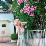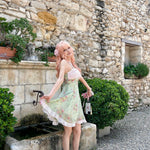 🫖🍵 A dreamy summer piece inspired by blooming gardens and afternoon tea in Europe. Combines a soft pastel mint matcha green floral print with a delicate blush-pink bow halter top, creating a vintage fairy-tale look.