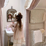The designer’s vision was to merge courtly elegance with doll-like feeling, creating a piece that feels timeless yet wearable for everyday moments. Loose in form yet rich in texture, the dress moves lightly with each step, like autumn air whispering through old manor halls.
