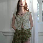 The top features a vintage-inspired lace-up bow design with a subtle V-neck that delicately frames the collarbone—effortlessly sweet with a touch of laid-back charm.