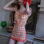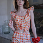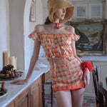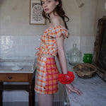 The irregular orange plaid print, perfectly matching the top, adds a sweet retro style that’s both charming and cute girly vibe