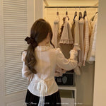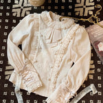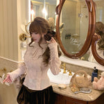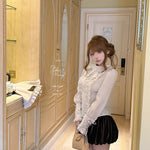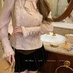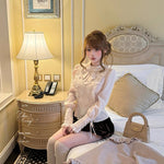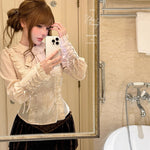 This blouse blends French court elegance with doll core sweetness. The soft beige tone evokes a quiet, noble charm — perfect for layering with pastel skirts or velvety shorts for a timeless coquette core or babydoll outfit.