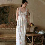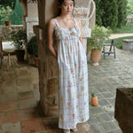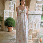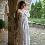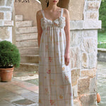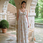 Crafted with soft florals framed in pastel windowpane checks, and adorned with hand-gathered floral appliqués at the bodice, it carries the scent of sun-warmed courtyards and early garden blooms.