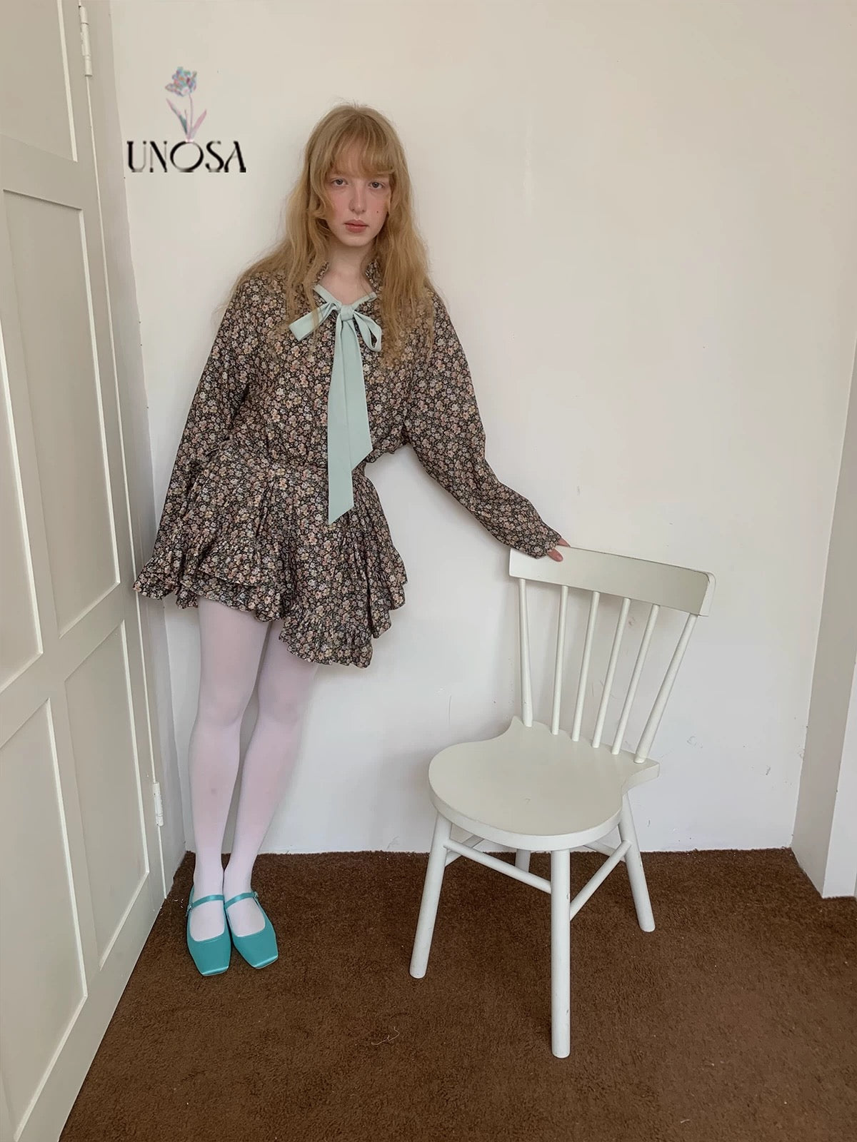 Style keywords: romantic floral dress · vintage bow dress · coquette outfit · mint green accent · winter day aesthetic