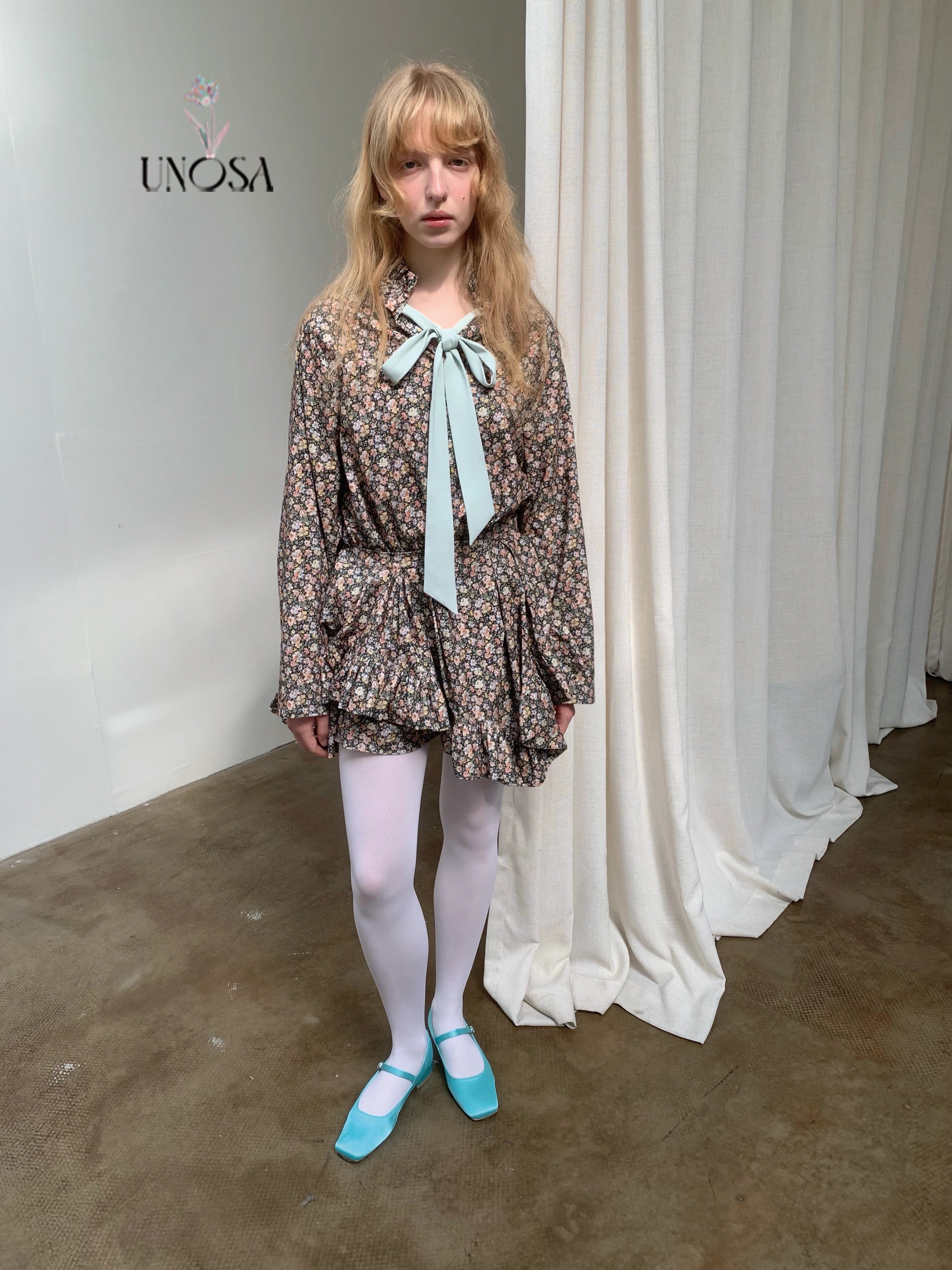 Adorned with a mint satin ribbon bow, the dress adds a playful yet elegant contrast to the vintage floral print.