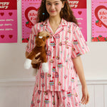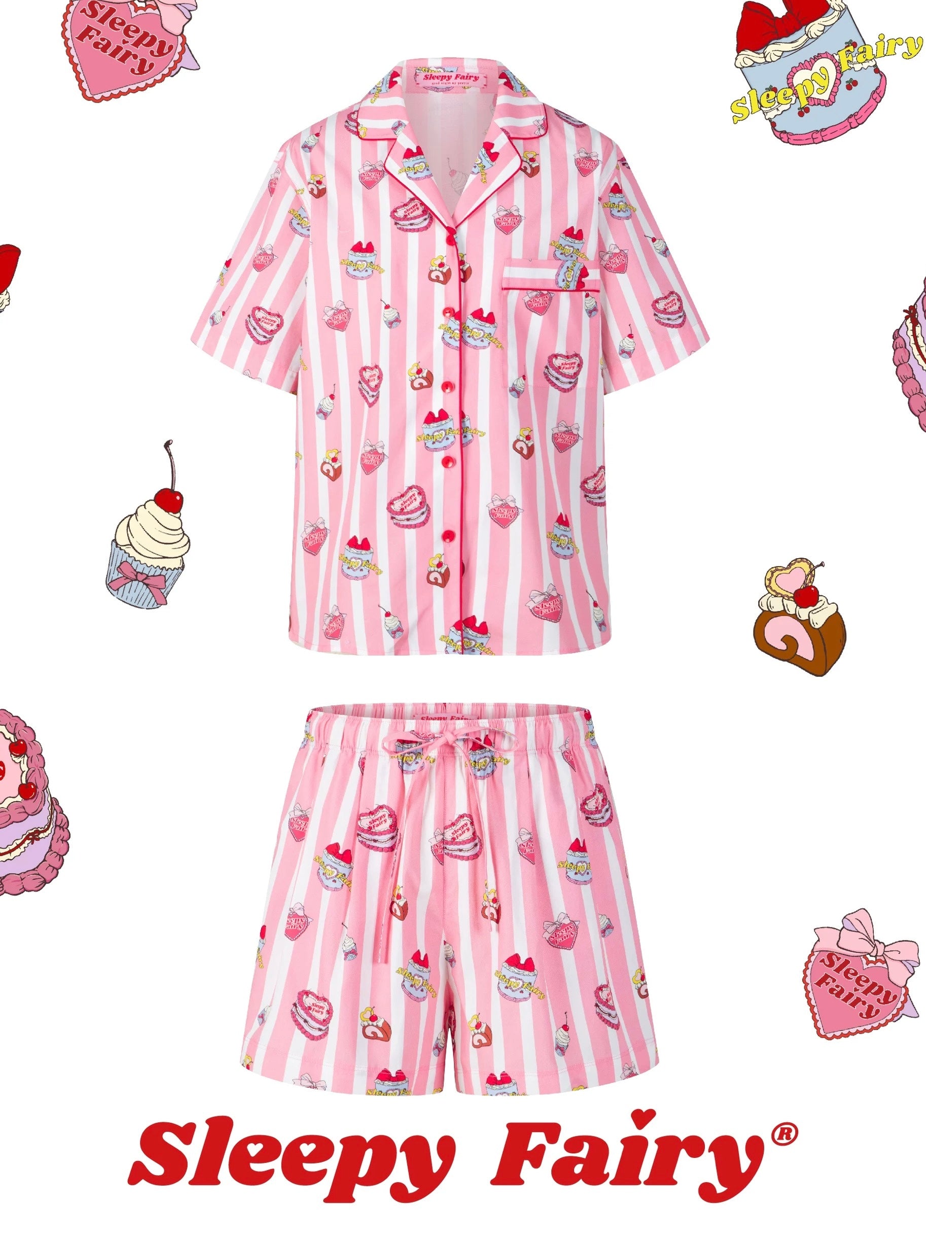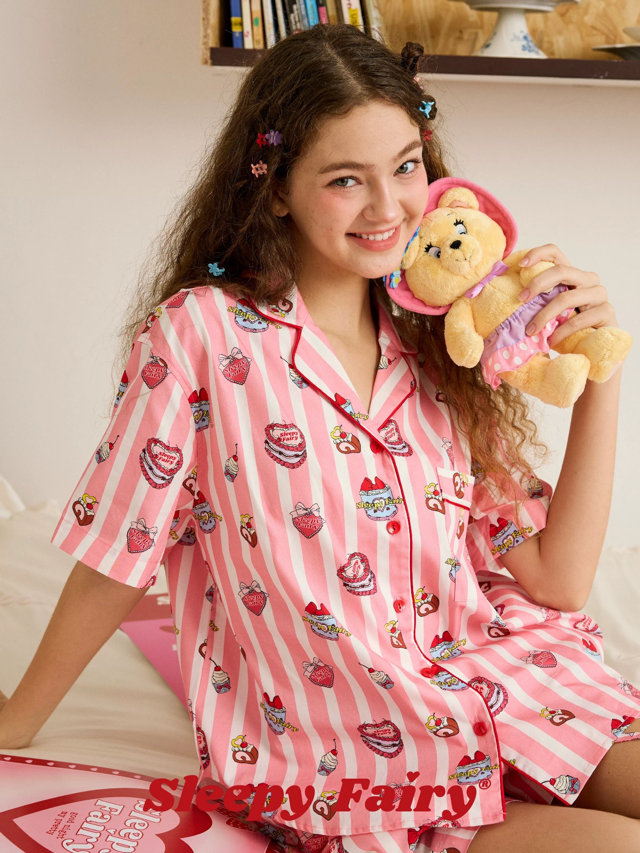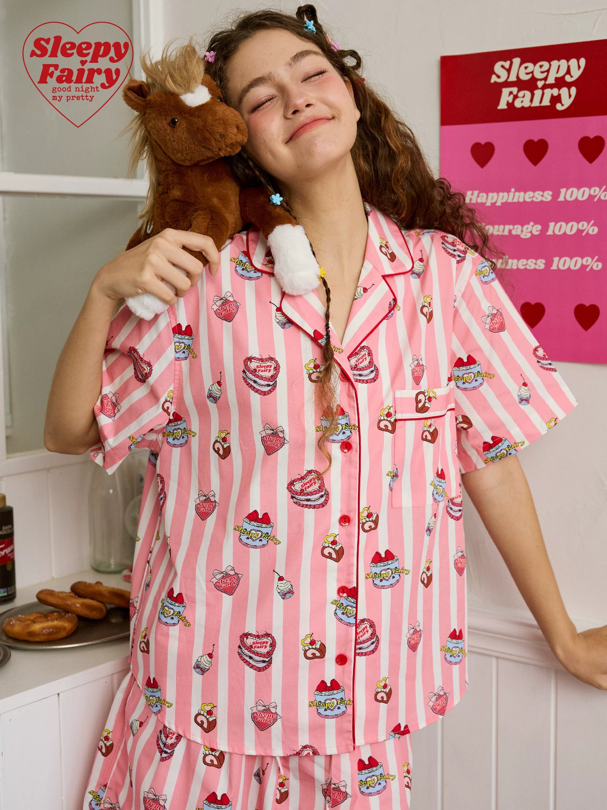 Designed with classic pink and white candy stripes and sprinkled with adorable Sleepy Fairy cake and dessert illustrations, this set feels like a little birthday party you can wear at home. The relaxed long-sleeve shirt pairs perfectly with the matching straight-leg pants, creating an effortlessly cute retro lounge look.