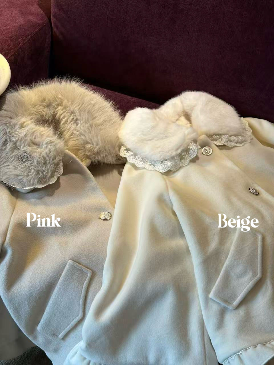 The Rose Candy Showa Princess Cape Coat combines vintage sweetness with cozy warmth — featuring a soft detachable faux fur collar and Japanese princess style puffed sleeves.